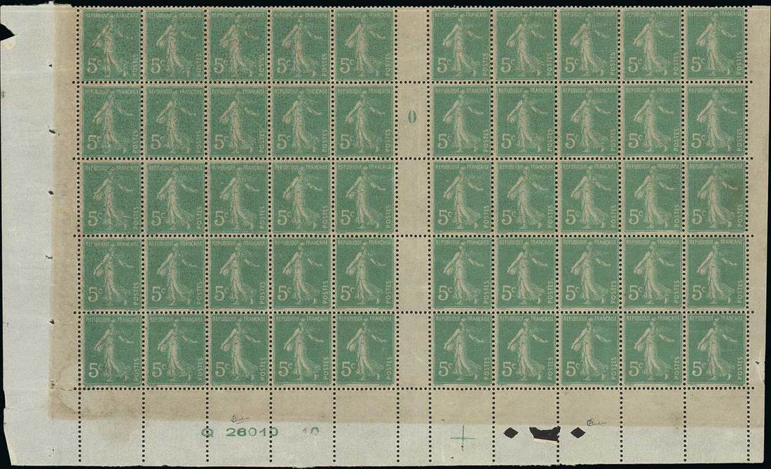 5c. green type I, block of fifty (two panes of twenty-five) with Millésime "0", variety gummed on both sides, unmounted mint; superb. Spink Maury 137