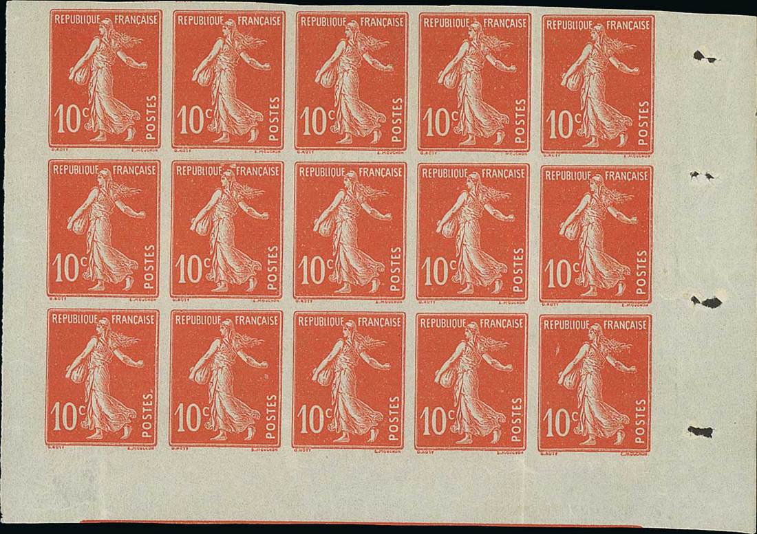 10c. red, imperforate block of fifteen (5x3) from the foot of the pane, original gum with all except one remaining unmounted mint, a few small thin spots and vertical crease affecting the fourth row; fine. Spink Maury 138r. Photo