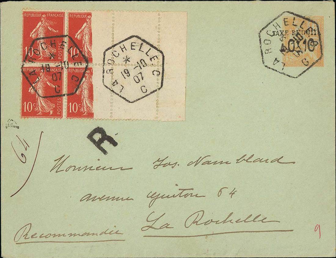 10c. red, block of six (3x2) from the right of the sheet with two complete impressions, two partial impressions and two with impression entirely omitted, tied to 15c. (Taxe Reduit/-0.10) postal stationery envelope; fine. Spink Maury 138. Photo