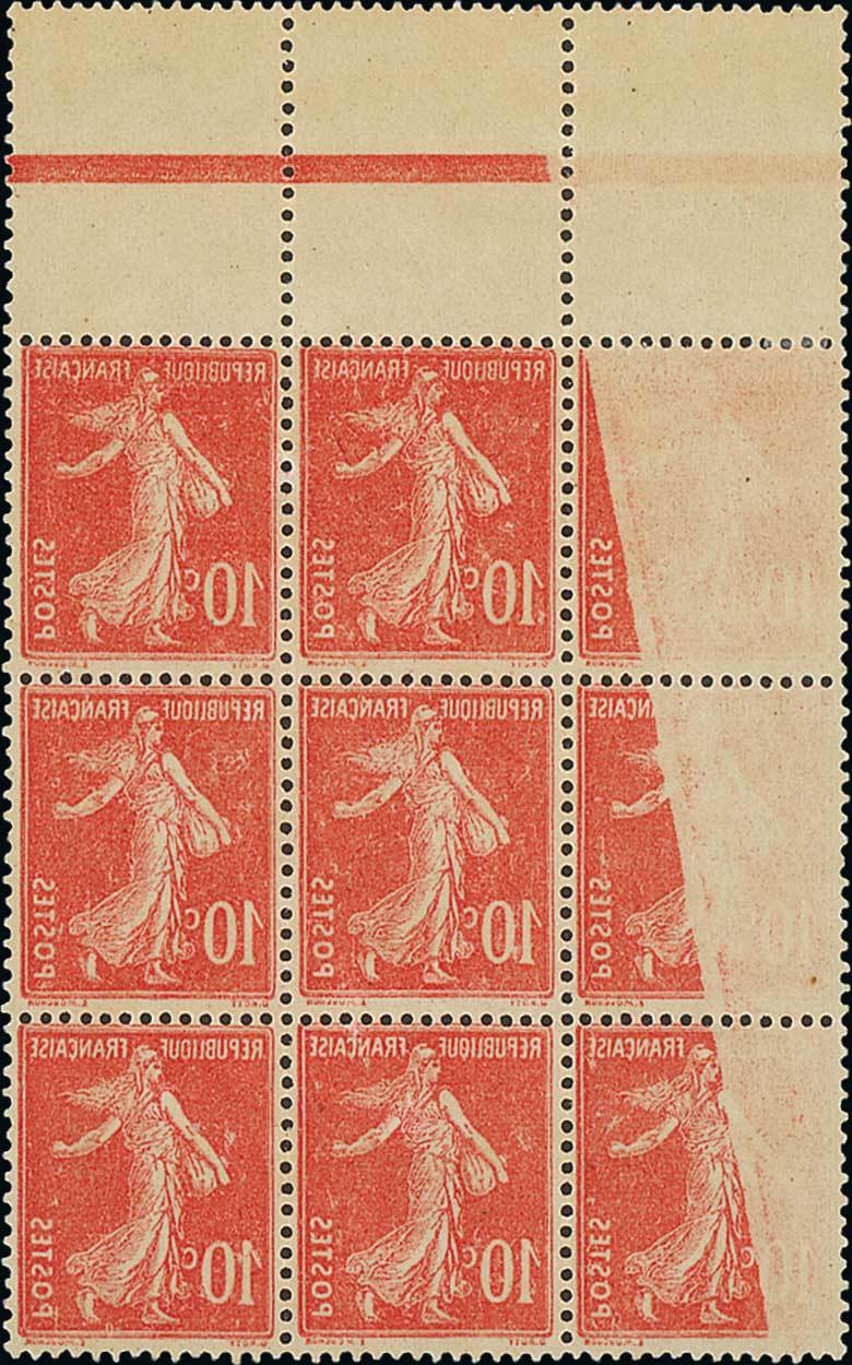 10c. red, block of nine (3x3) from the top of the sheet, exhibiting a fine offset on reverse of six complete and three partial impressions, original gum (two hinged on the face), the remainder unmounted mint; fine. Spink Maury 138. Photo