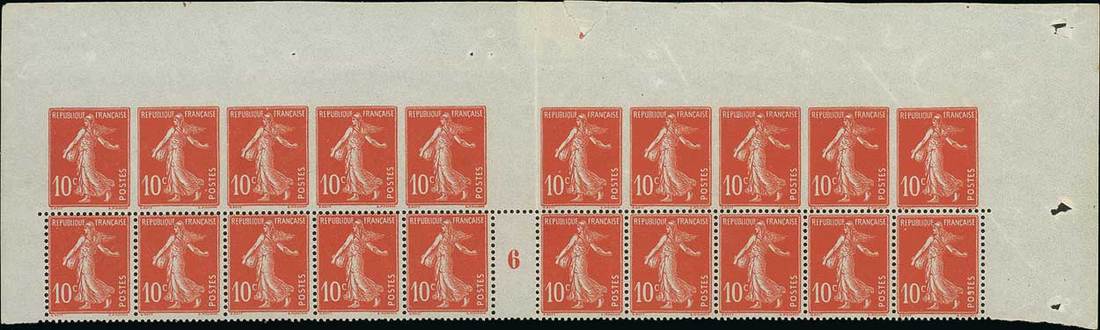 10c. red, block of twenty (10x2) the top two rows of the sheet with interpanneau margin and Millésime "6", ten pairs imperforate and perforate se-tenant, unmounted mint, hinged in the margins only; some wrinkles, fine and a spectacular block. Spink Maury 138IAo, €2,100+