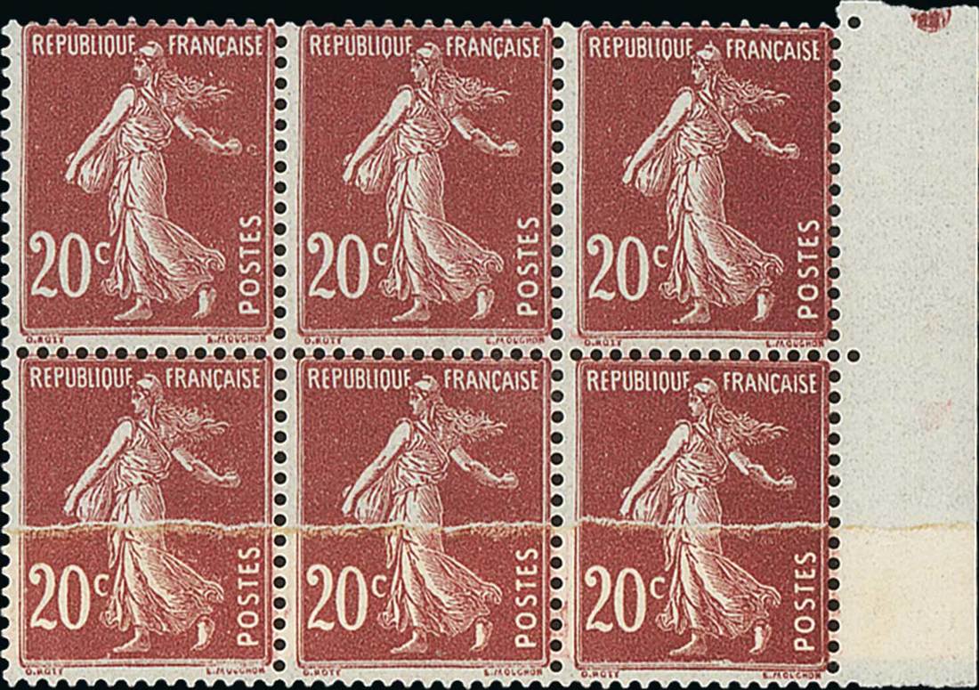 20c. brown-lilac, block of six (3x3) from the right of the sheet, the lower row showing an official paper join; unmounted mint, fine. Spink Maury 139. Photo