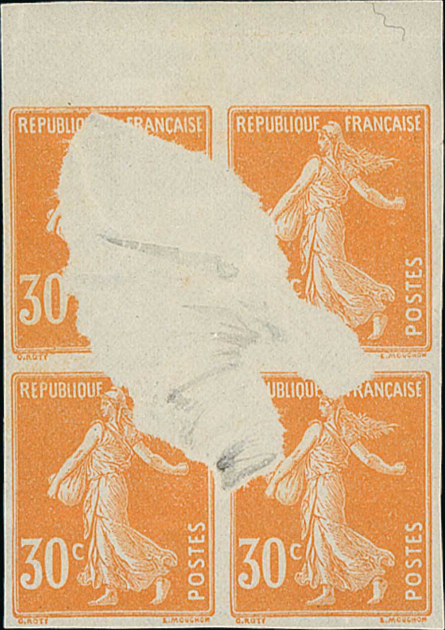 30c. orange, imperforate block of four from the top of the sheet, defective impression affecting all four stamps, original gum, natural paper flaws. Spectacular. Spink Maury 141. Photo