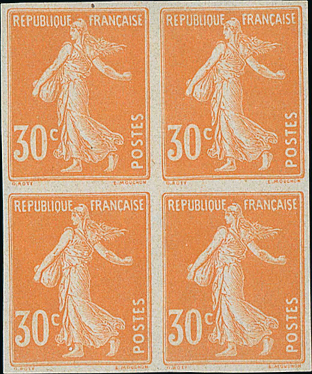 30c. orange, imperforate block of four, original gum with three remaining unmounted mint; fine. Spink Maury 141. Photo