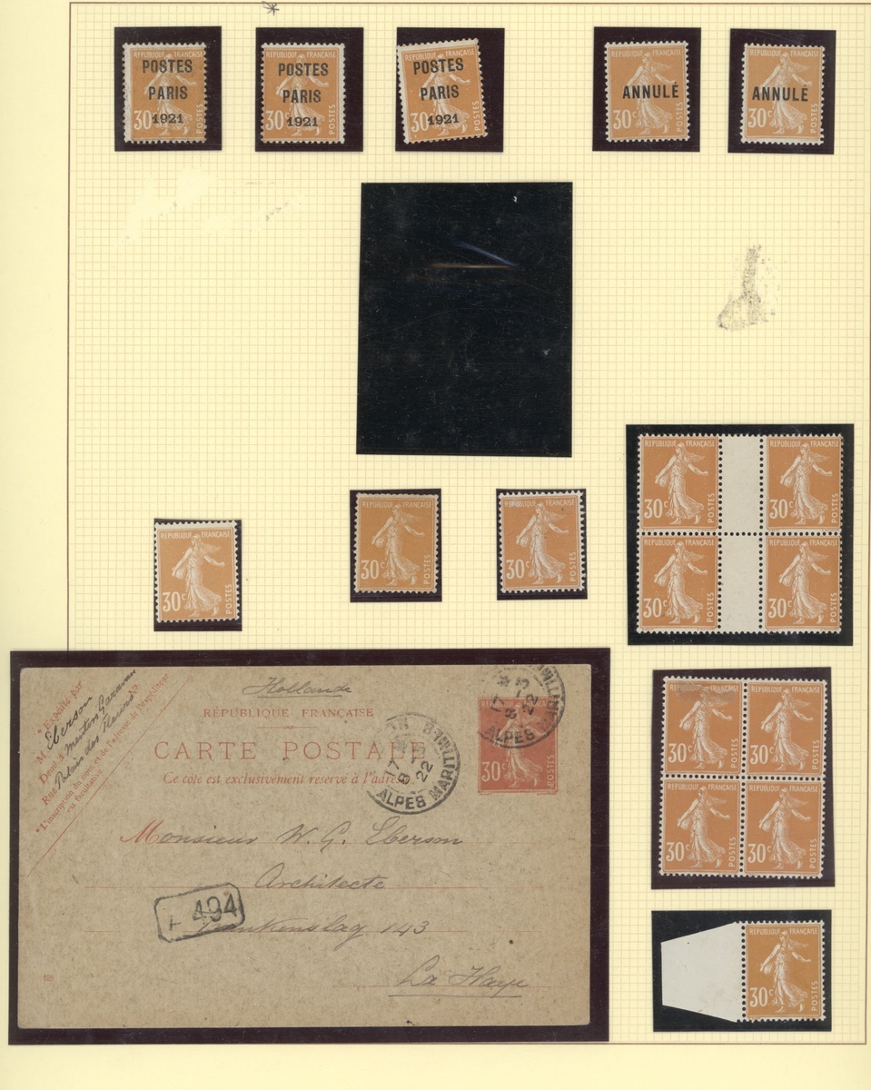 30c. orange, selection on pages, twenty-nine stamps, including blocks of four (2), pre-perforating paper folds with two singles, double perf. block of six, Pre-Cancel "Postes/Paris/1921" (3, one with gum), etc., chiefly fine. Spink Maury 141
