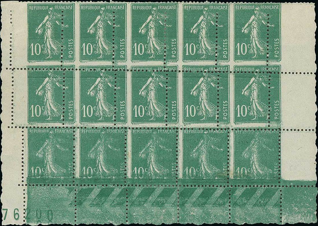 10c. green, thick figures, block of fifteen, (5x3) from the foot of the sheet, the first two rows with misplaced perfs., the lower row with overinked impressions, original gum with all but three remaining unmounted mint; a fine and spectacular block. Spink Maury 159. Photo