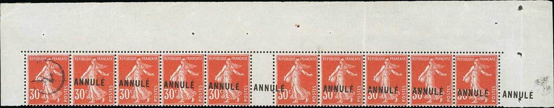 30c. scarlet, horizontal strip of ten from the top of the sheet with interpanneau margin, overprinted