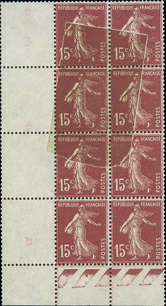 15c. brown-lilac, block of eight (4x2) from the lower left corner of the sheet showing an official paper repair to the upper block of six; unmounted mint, fine and a spectacular block. Spink Maury 189. Photo