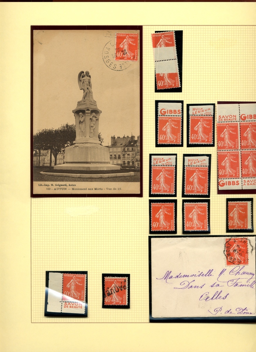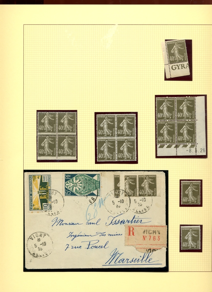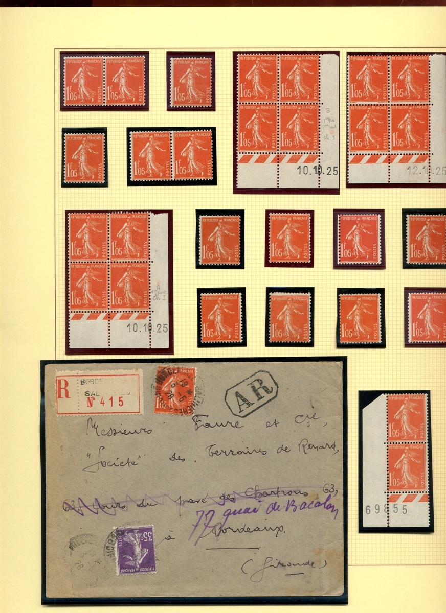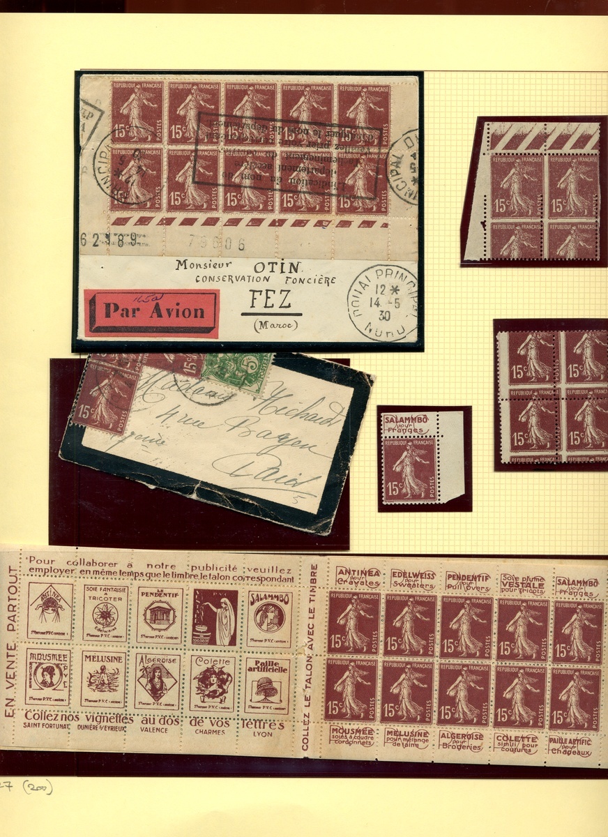 15c. brown (42 with booklet of ten, misperforated block of twenty), 20c. lilac-rose (3 sheets of 100), 30c. blue (12, mostly precancelled), 4c. brown-olive (17), 40c. vermilion (67), 1f. 05 vermilion (20) and 1f. 40 (15), chiefly mint and fine