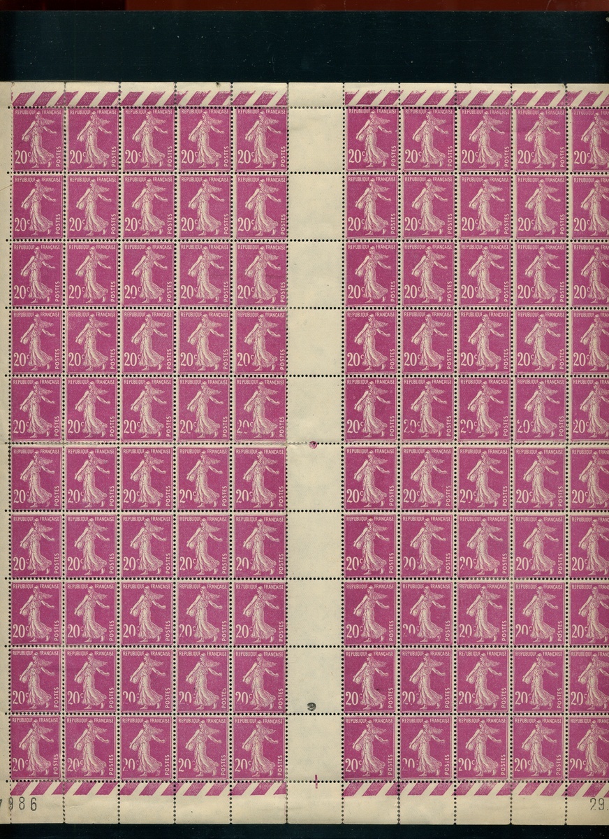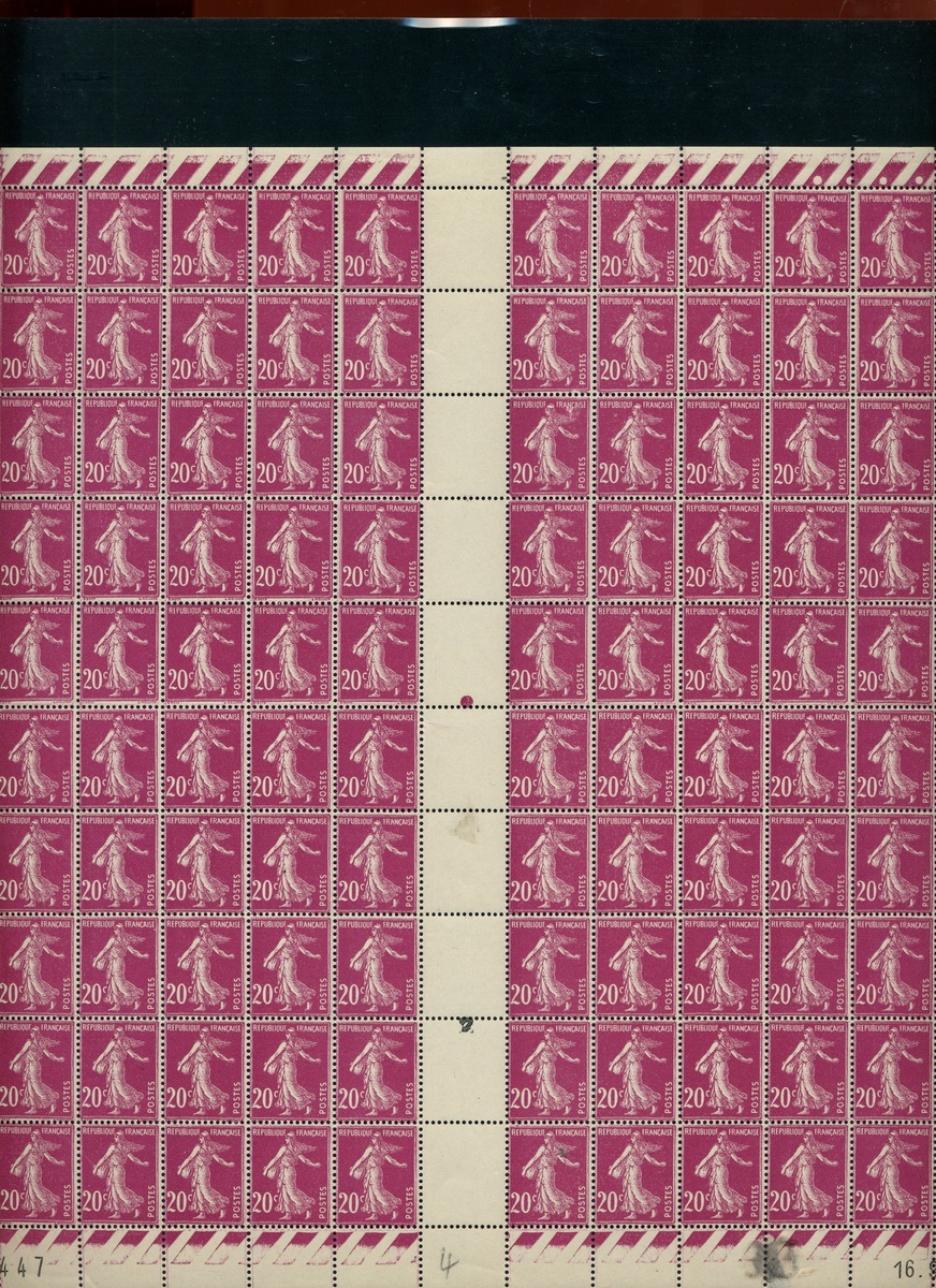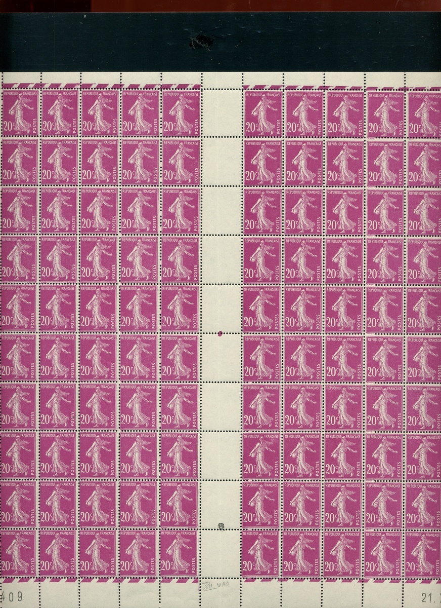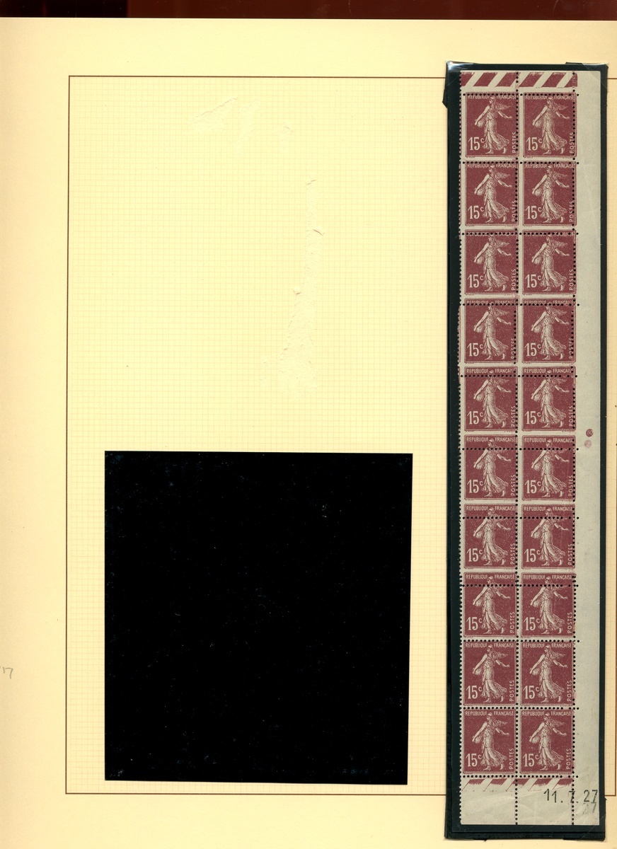 15c. brown (42 with booklet of ten, misperforated block of twenty), 20c. lilac-rose (3 sheets of 100), 30c. blue (12, mostly precancelled), 4c. brown-olive (17), 40c. vermilion (67), 1f. 05 vermilion (20) and 1f. 40 (15), chiefly mint and fine