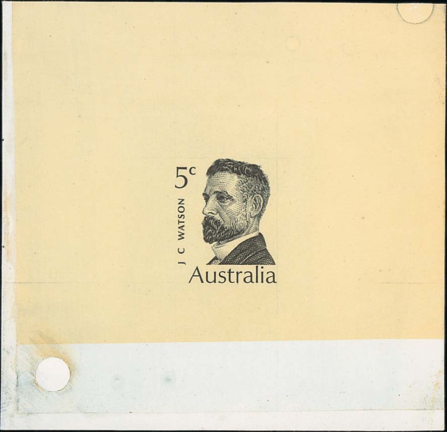 Watson 5c. engraved die proof in black on yellowish surfaced card (75x73mm.), fine. Photo