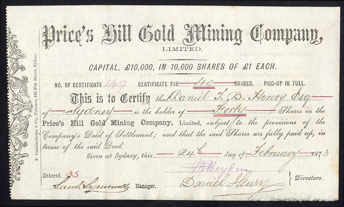 Australia: Price's Hill Gold Mining Co. Ltd., New South Wales, £1 shares, 187[3], #149, small format, black. EF and rare.
