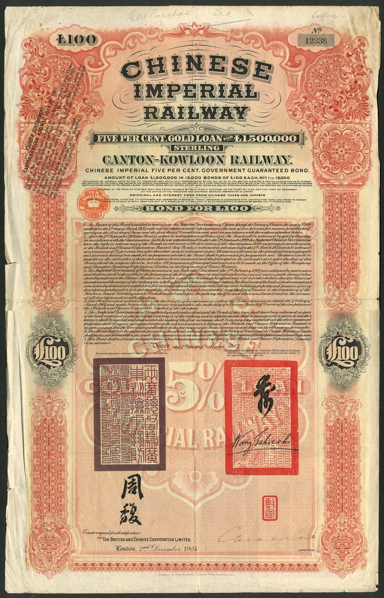China: 1907 Canton-Kowloon Railway 5% Gold Loan, bond for £100, #12338, large format, red and black, printed by Waterlow, with coupons. Left edge somewhat cresed but VF.