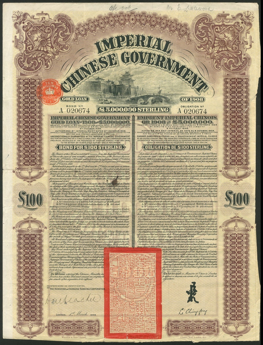 China: 1908 5% Gold Loan, Bond for £100 issued by the Hongkong and Shanghai Banking Corporation, #020674, walled city at top, mauve and black, red chop bottom centre, printed by Waterlow, no coupons remain as is usual. Small ink stain in centre, tear at right edge, VF.