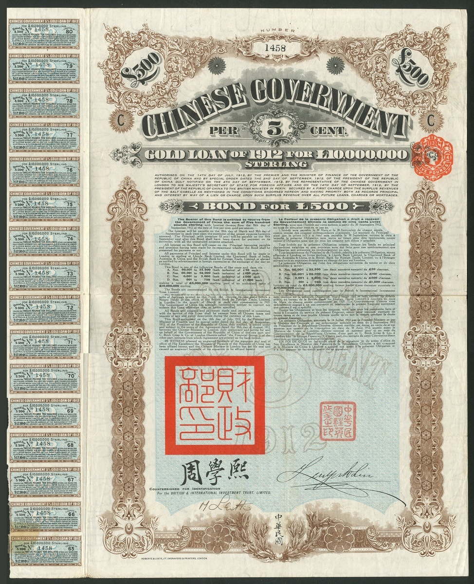 China: 1912 5% Gold Loan, bond for £500, #1458, large format, ornate border, brown and black with pale blue underprint, with coupons. VF.