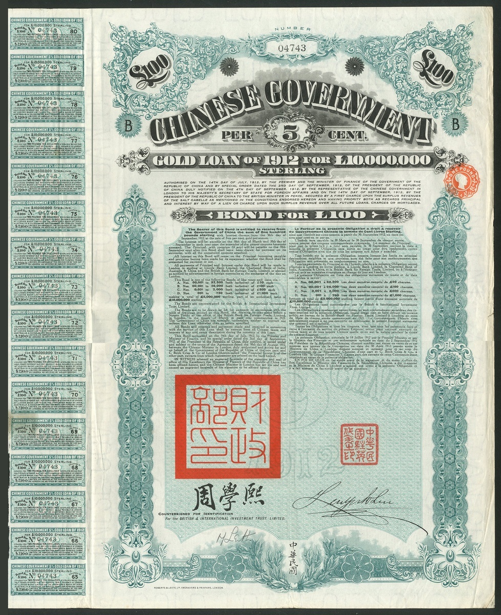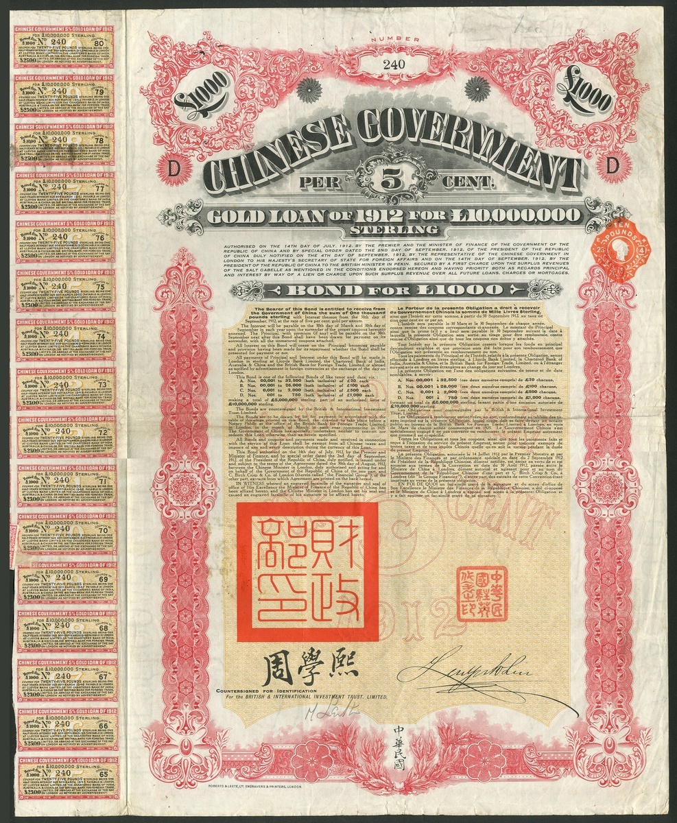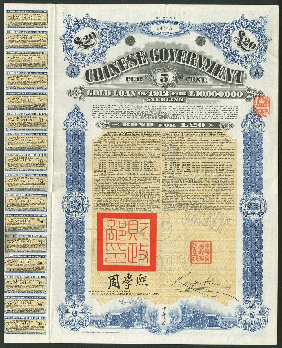 China: 1912 5% Gold Loan, a set of bonds for £20, £100, £500, #1794 and £1000, #240, large format, bue, turquoise, brown and red respectively, with coupons. The £1000 has a small tear at bottom edge otherwise all are VF and better (4).