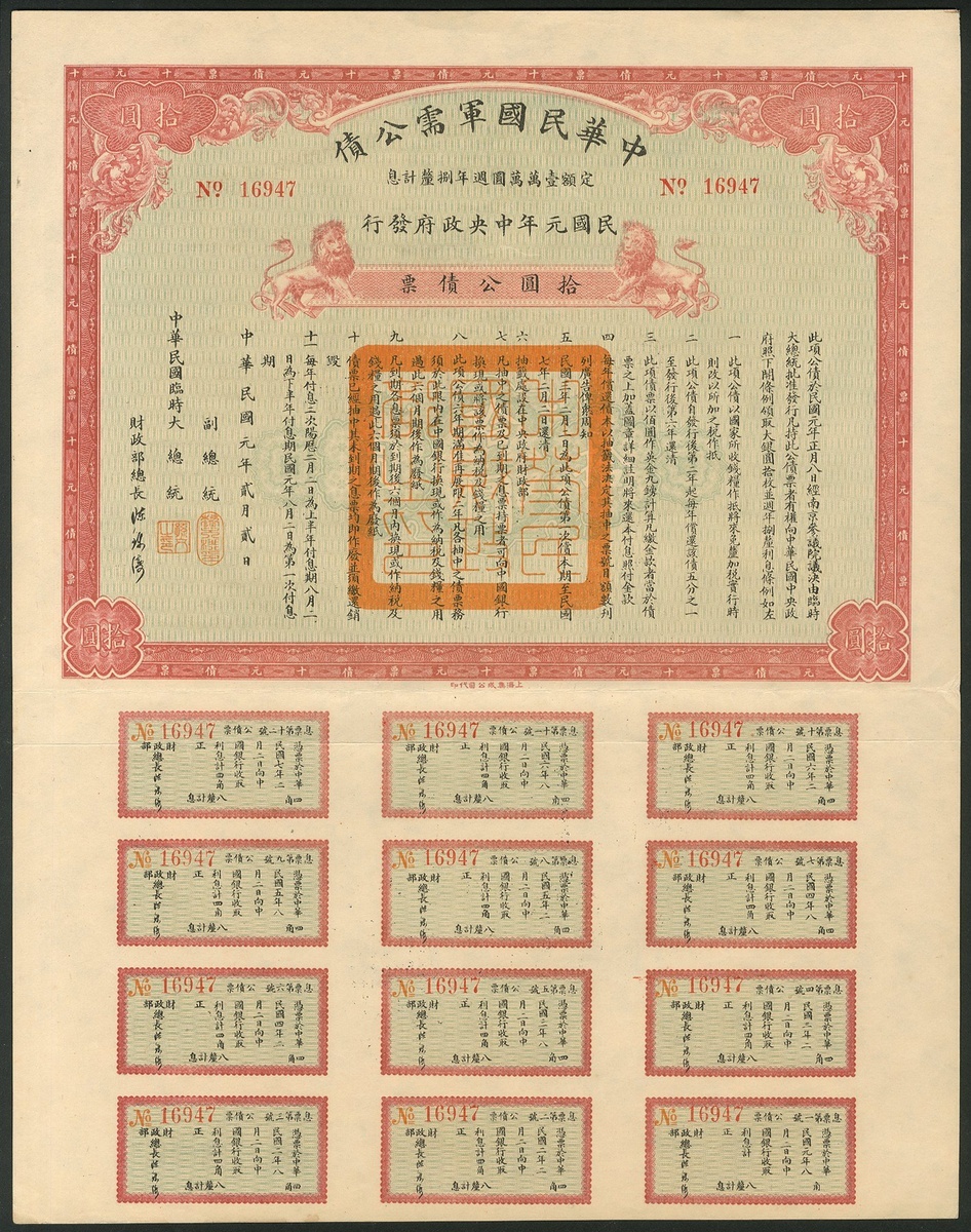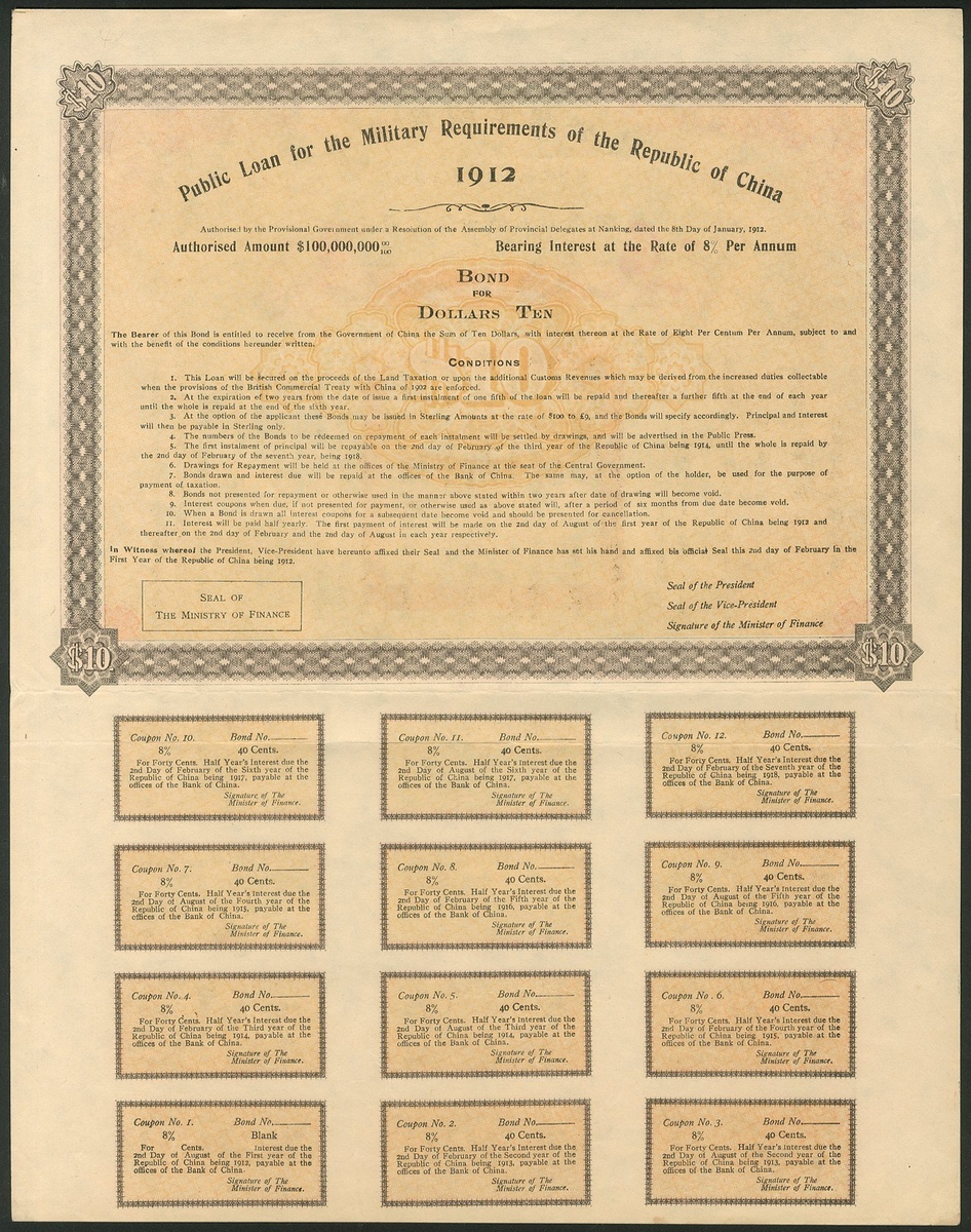 China: 1912 8% Public Loan for the Military Requirements of the Republic, bond for $10, #16947, red and blue, text in Chinese with English on the reverse, with coupons. AEF.
