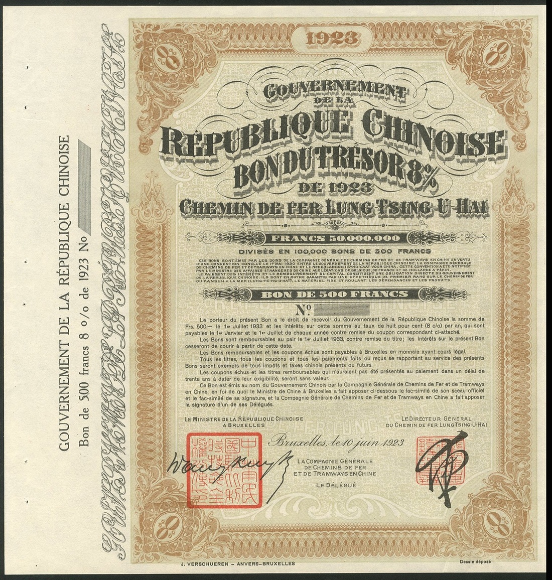 China: 1923 Lung Tsing U Hai Railway 8% Treasury Loan, unissued bond for 500 francs, ornate border, brown, with all coupons and counterfoil. EF.