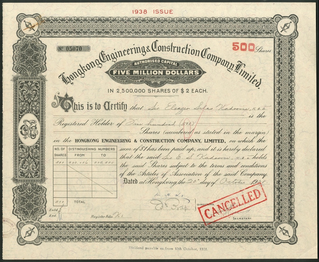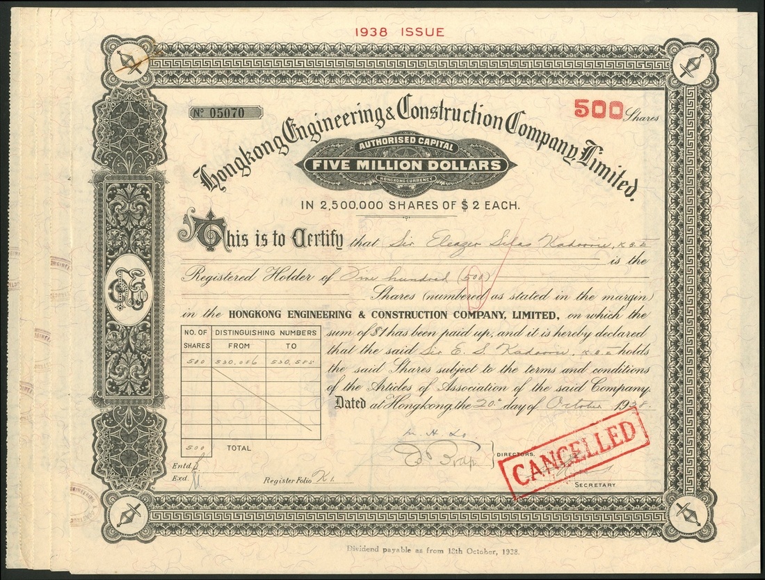 Hongkong: Hongkong Engineering & Construction Co. Ltd., a group of 5 certificates for $2 shares, $1 paid, 19[38], black, ornate borders, capital $5 million. All signed by the Hon Jose Pedro Braga who was appointed chairman in 1930. Founded in 1922 and responsible for many important projects such a spower stations, docks and wharfs. and air raid shelters. Rusty staple holes otherwise EF (5),