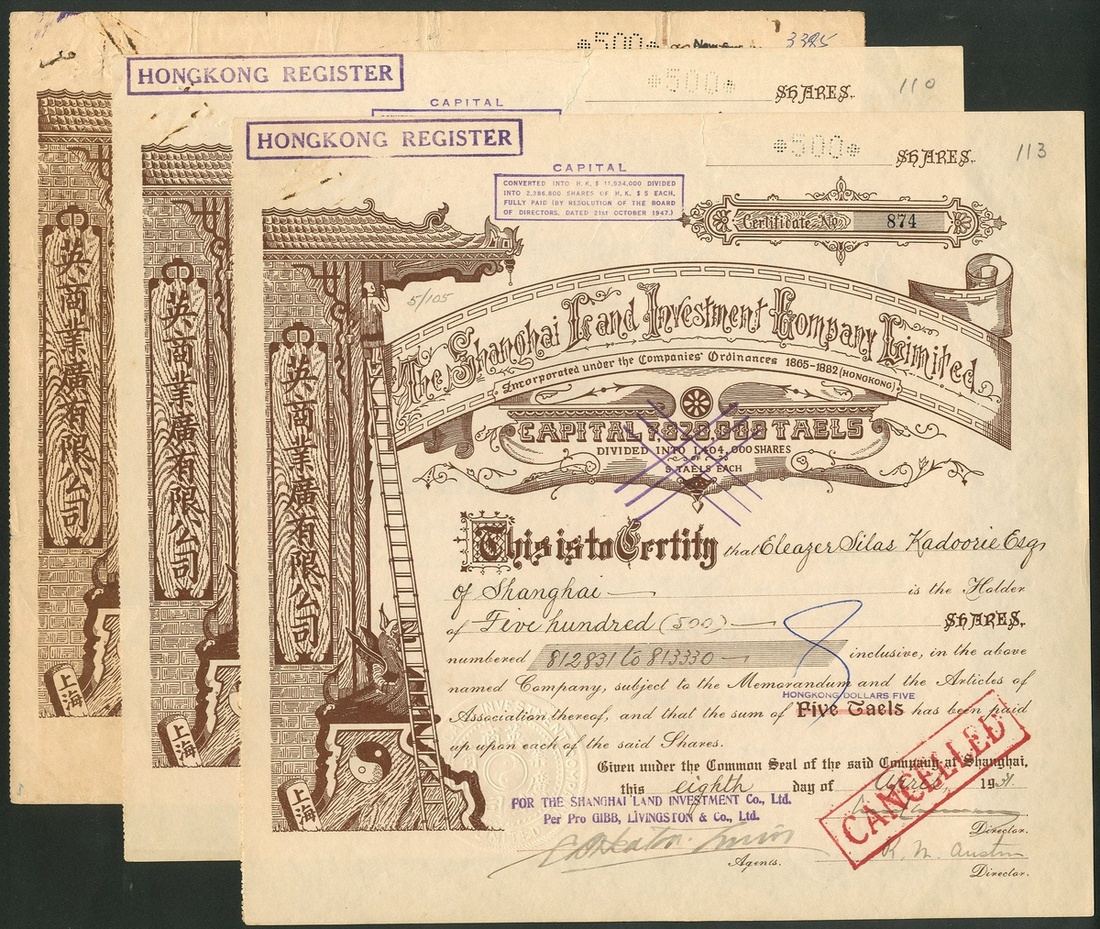 China: Shanghai Land Investment Co. Ltd., a trio of certificates for 5 tael shares, 2 dated 19[31] and one 19[41], full height vignette of Chinese workman painting a house at the top of a ladder, brown. Two with edge tears at top, F-VF (3).