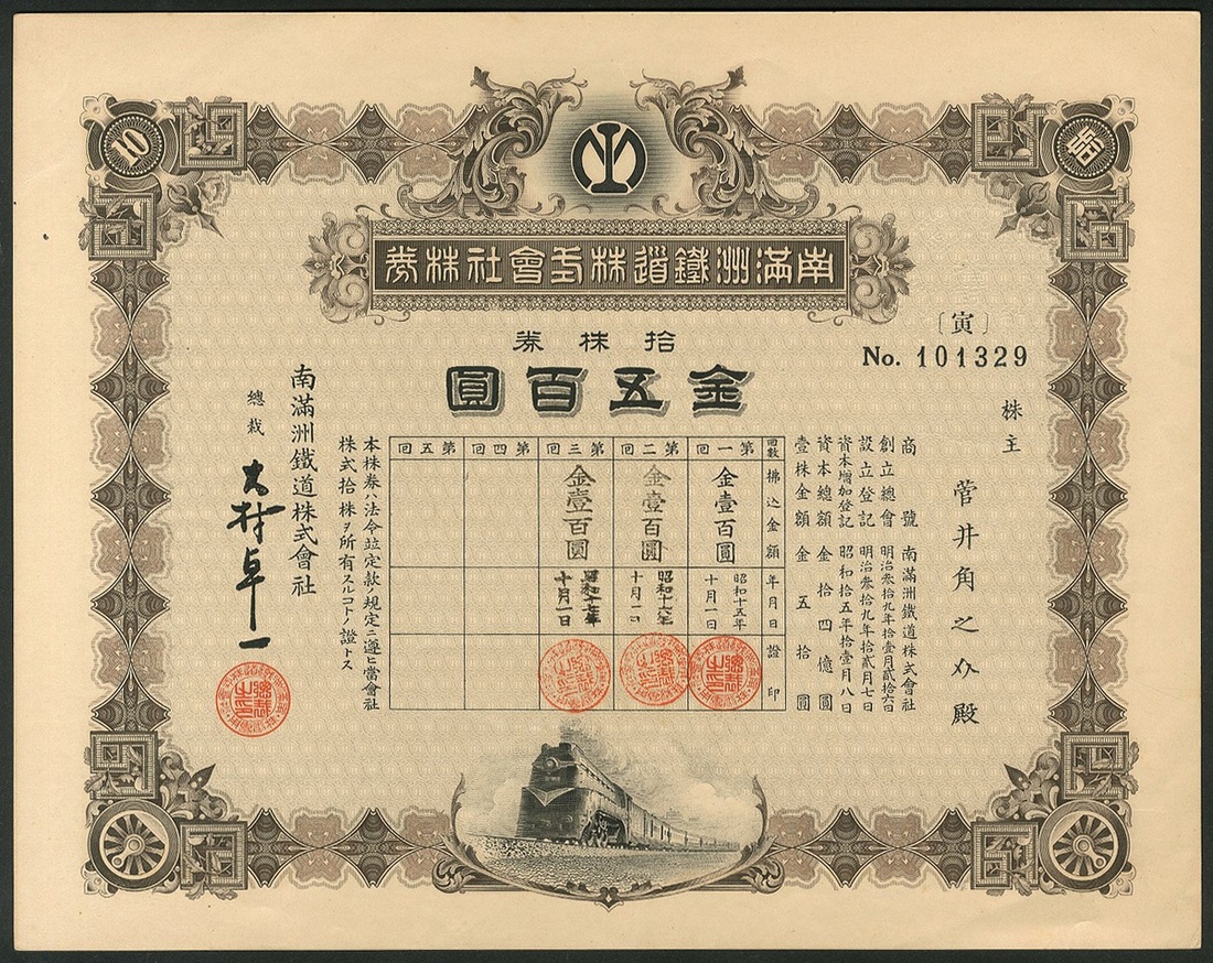 China: South Manchuria Railway Co. Ltd., certificate for 10 shares of 50 yen, Showa 15 (1940), streamlined train at bottom, ornate border, brown and black. Founded by Imperial Japan in 1906 following the Russo-Japanese War, when the lease of the Liaottung Peninsula was transferred from Russia to Japan. The South Manchuria railway was originally built as an extension of the Russian owned 'Chinese Eastern Railway' but became one of the largest companies in the region, controlling many other businesses in the 'Railway Zone'. AEF.