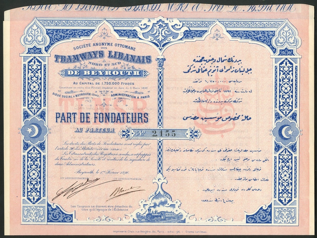Ottoman Empire: S.A.Ottomane des Tramways Libanais Nord et Sud de Beyrouth, founders share, Beyrouth 1896, #2155, attractive piece with small steam train at bottom, Arabesque borders, blue and pink, with coupons. EF.