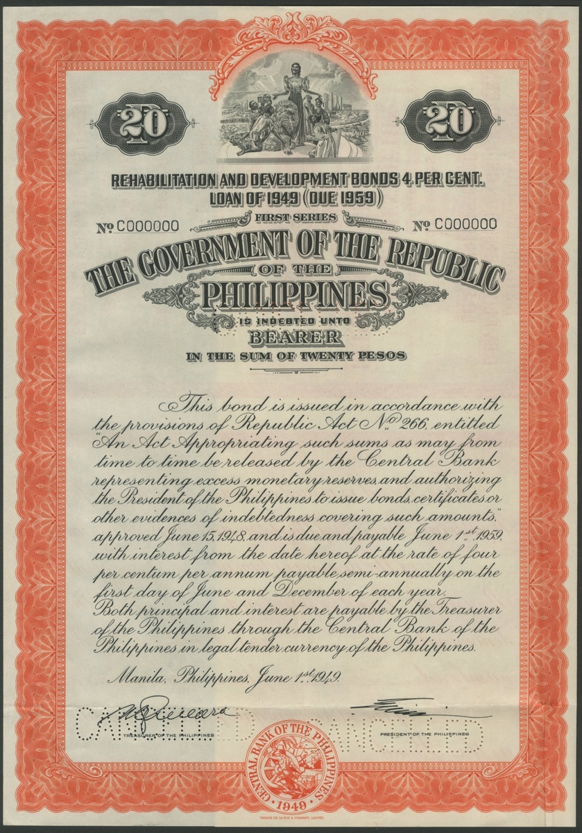 Philippines: 1949 Rehabilitation and Development 4% Loan, a specimen bearer bond for $20 pesos, Manila 1949, numbered C000000, allegorical figures at top, orange and black, printed by Thomas de la Rue & Co. Ltd., with coupons. EF and rare.