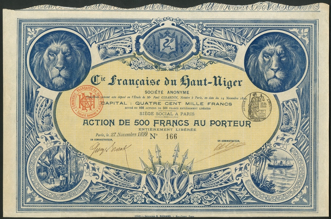 French West Africa: Compagnie Francaise du Haut-Niger S.A., 500 franc share, #166, Paris (1899), attractive piece with vignettes of natives harvesting produce from palms, small steamship, lions heads and coat of arms, blue with yellow underprint, only 800 issued, lacks coupons AEF.