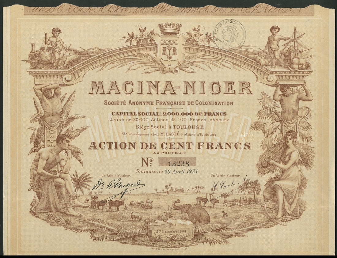 French West Africa: Macina-Niger, S.A. Française de Colonisation, 100 franc share, Toulouse 1921, #13238, very pretty piece with allegorical figures and various animals, brown, with coupons. EF.