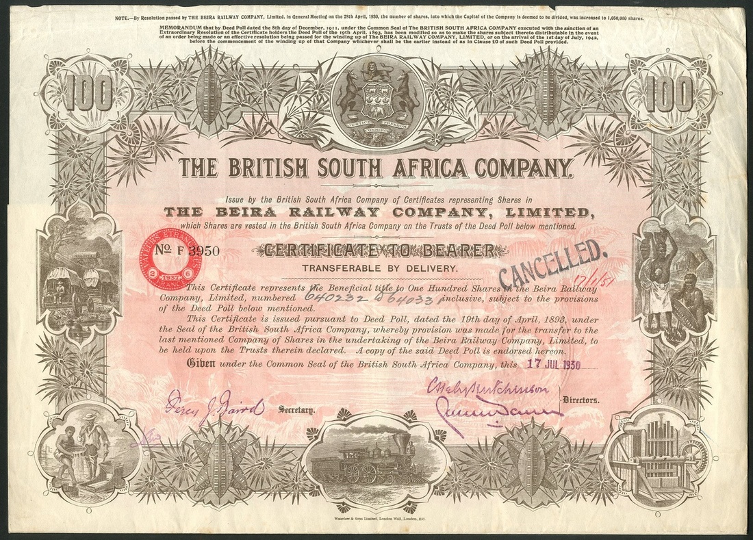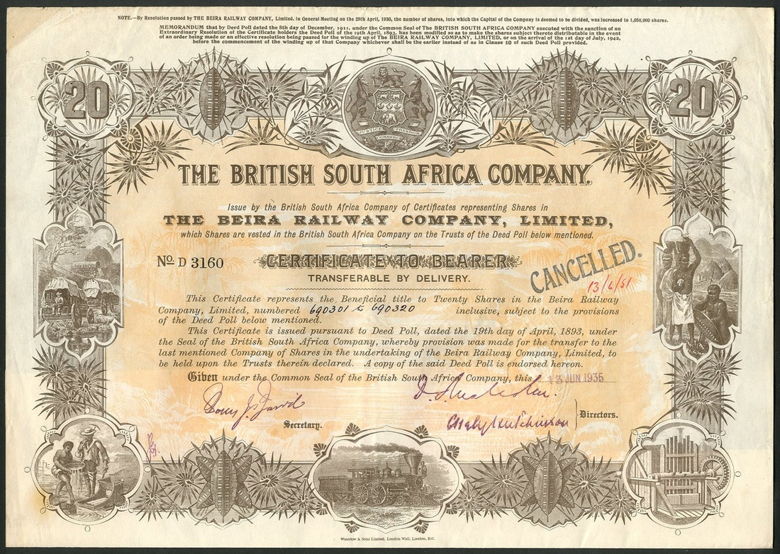 Rhodesia/Mozambique: Beira Railway Co. Ltd., a set of certificates issued by the British South Africa Company, for 20, 50 and 100 shares, dated 1935 and 1930, ornate border with steam train at bottom, wagons left, natives right, coat of arms at top, brown printing with yellow, green and pink underprints respectively, printed by Waterlow & Sons, with coupons. The line was built to connect the Port of Beira with Salisbury in Rhodesia and to the South African railway network. VF and better (3)