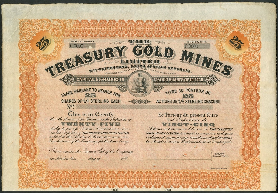 South Africa: Treasury Gold Mines Ltd., Witwatersrand, specimen bearer warrants for 1 share, 189- and 19- and 25 shares, 189-, printed by Blades, East & Blades, all with ornate borders, cherub with cornucopia in centre, red, blue and black and orange and black, respectively, text in English and French, with coupons, hole cancels in signature area. VF and better (3 items).