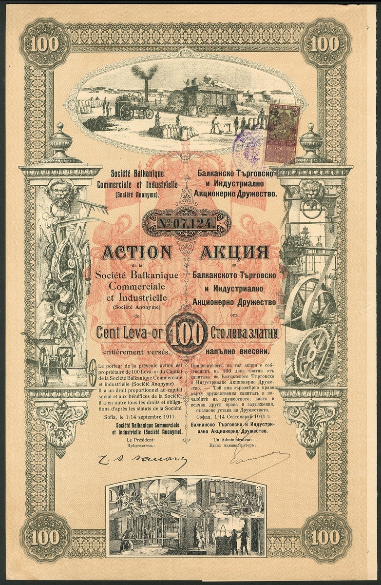 Bulgaria: Société Balkanique Commerciale et Industrielle S.A., 100 Leva share, Sofia 1911, #7124, very attractive piece with vignettes of steam traction engine and haymaking, with further industrial scenes at bottom, green, red, buff and black, with coupons.EF.