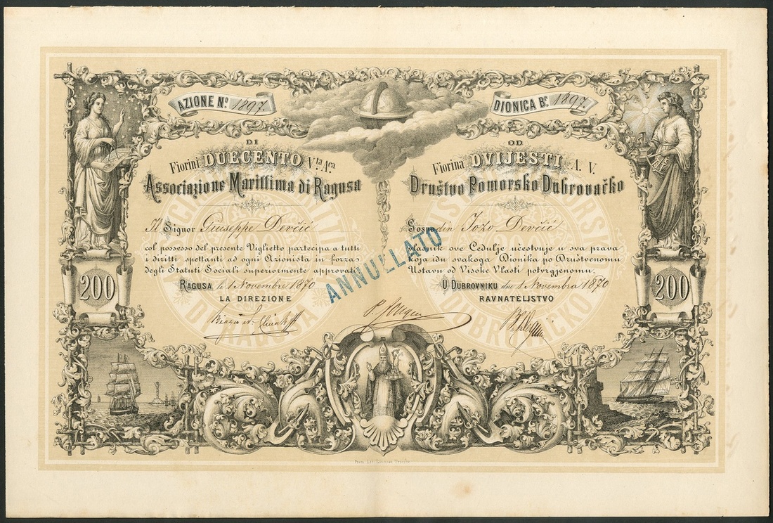 Croatia: Maritime Association of Ragusa, certificate for 200 florin share, Ragusa [1870], #1897, beautiful piece with ornate border including allegorical figures at sides, Pope surrounded by scrollwork at bottom, and shipping scenes, black with buff underprint, stamp ANNULATO. slight ink bleed through at right side, otherwise EF.