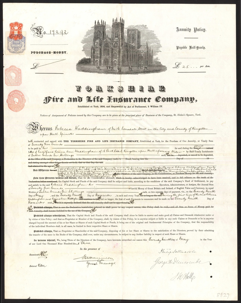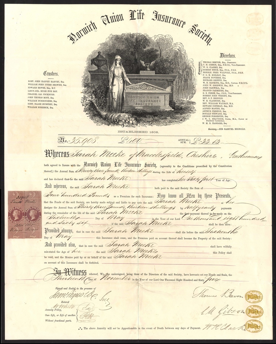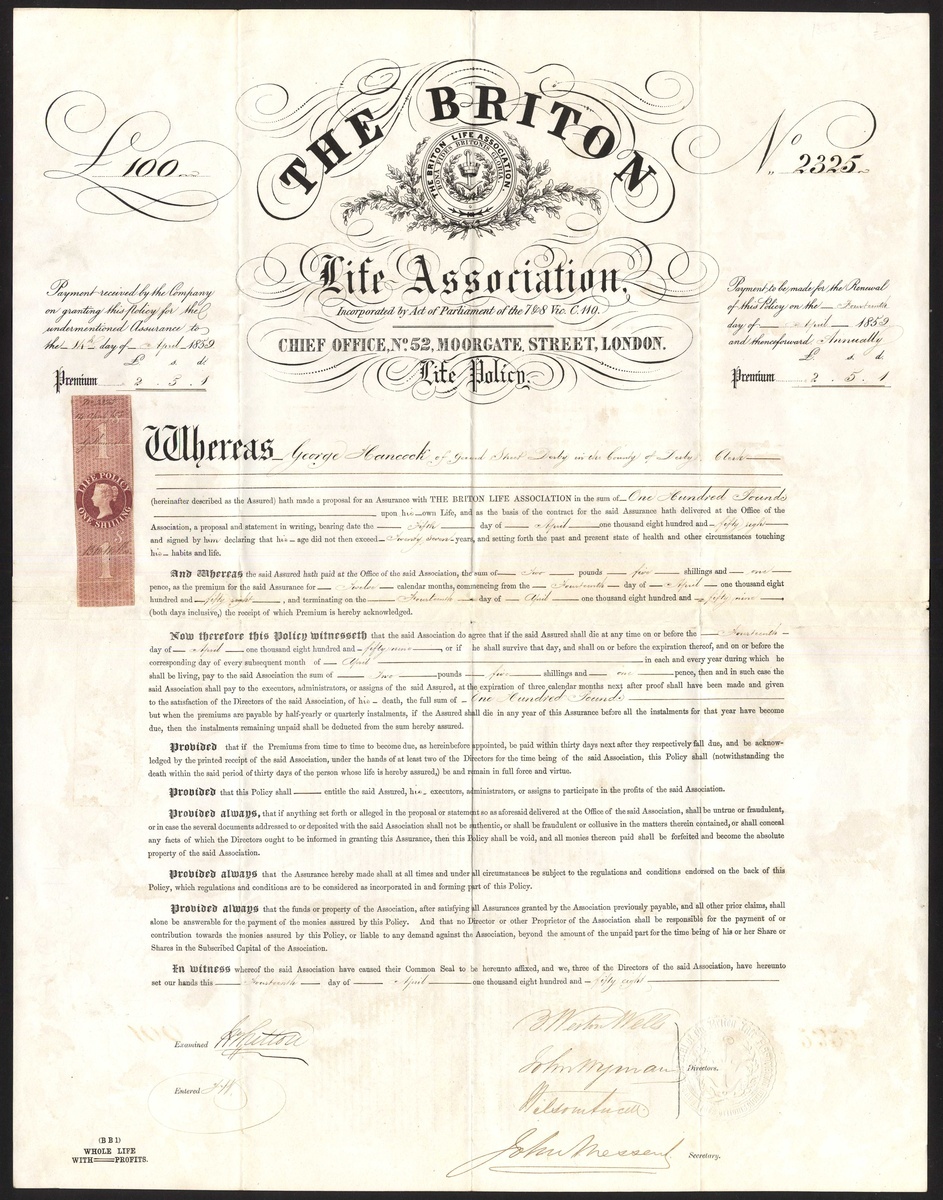 Great Britain: Life Insurance: An interesting group of life insurance policies, comprising Briton LIfe Association, 18[58] for £100, arms at top, adhesive 'Life Policy' 1 shilling revenue stamp, black; Norwich Union Life Insurance Society, 18[65], £400, large vignette, pair of 2 shilling 'Life Policy' revenue stamps; Yorkshire Fire & Life Insurance Company, Annuity policy, 19[03], vignette of York Minster, black; Royal Insurance Company, Own Life, £100, 186[4], adhesive 1 shilling revenue stamp (faded), and, Provincial Insurance Company, £200, 18[62], Prince of Wales feathers, adhesive 2 shilling adhesive revenue stamp. The last with many folds, stained and soe sparation at folds, the remainder F-VF and all scarce (5).