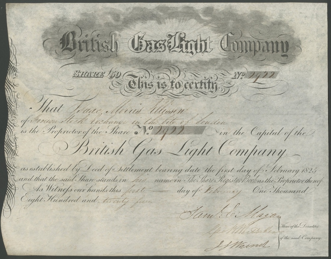 Great Britain: British Gas Light Company, £50 share, 18[25], #2922, attractive black printing, on vellum, scrollwork at left. One of the largest companies formed in 1824. Nationalised in 1948. AEF and scarce.