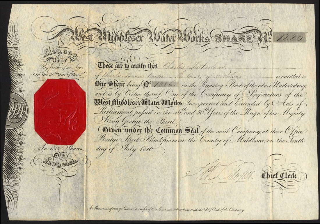 Great Britain: West Middlesex Water Works, one share of £100, 1810, #1226, attractive black printing, on vellum, red paper seal at left. Established in 1806 at Hammersmith, West London to supply water to the Marylebone and Paddington areas of London. Acquired by the Metropolitan Water Board in 1903. Tri-folded, GVF.
