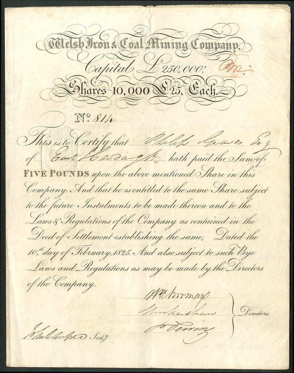 Great Britain: Welsh Iron & Coal Mining Company, £25 share, £5 paid, 1825, #814, black, 4 pages, further installments recorded on inside. The company was floated with the large capital of £250,000 and acquired four Denbighsire / Flintshire iron works: Aberderfyn, Coed Talon, Leeswood, and Llwyneinion. The company was short lived, failing in 1829 at the same time as managing partner and major shareholder Thomas Jones was declared bankrupt, indication that there was un-ethical practice and poor management to blame. Coal was mined at this location in following years, but most likely by a new company. GVF.