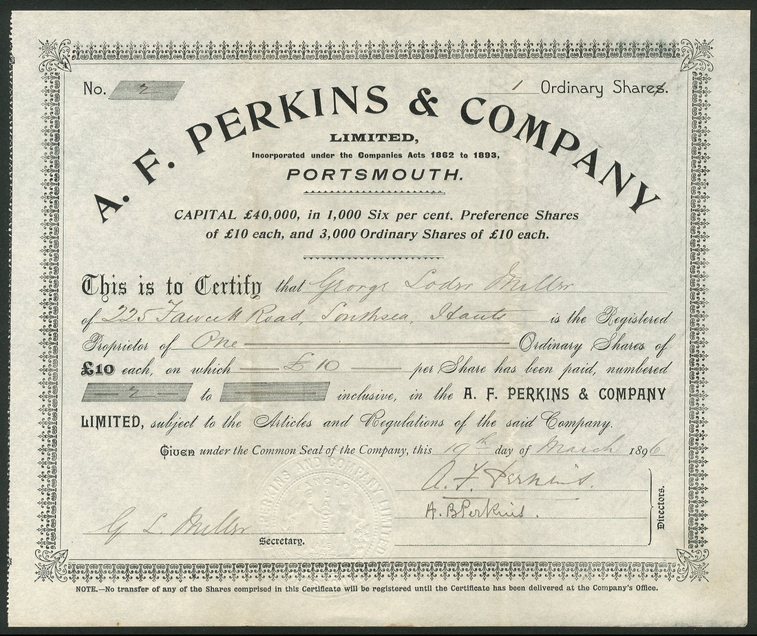 Great Britain: A.F. Perkins & Company Ltd., £10 ordinary shares, 189[6], #2, ornate border, black. Lager, Ale and Stout brewers in Portsmouth, in liquidation by 1900. GVF.