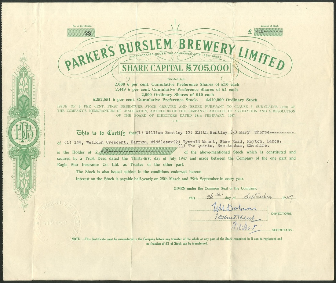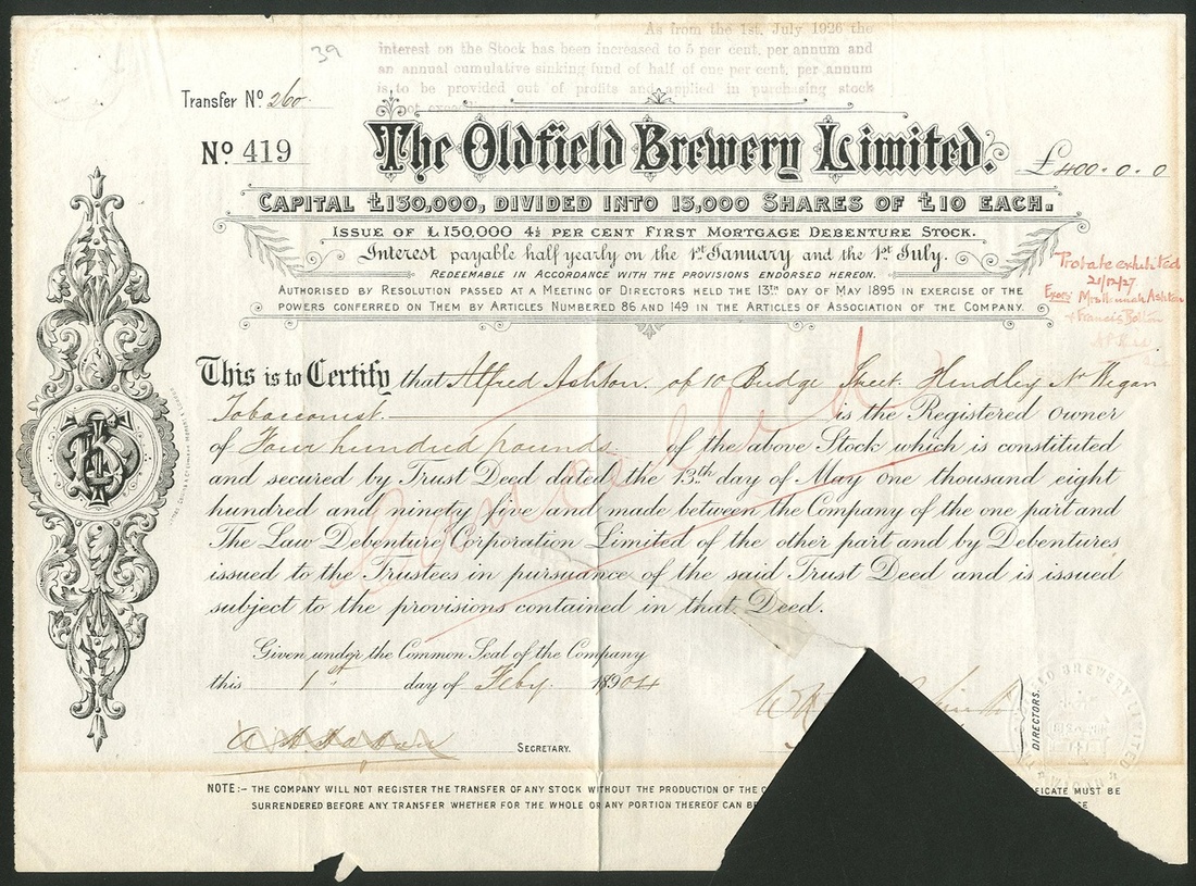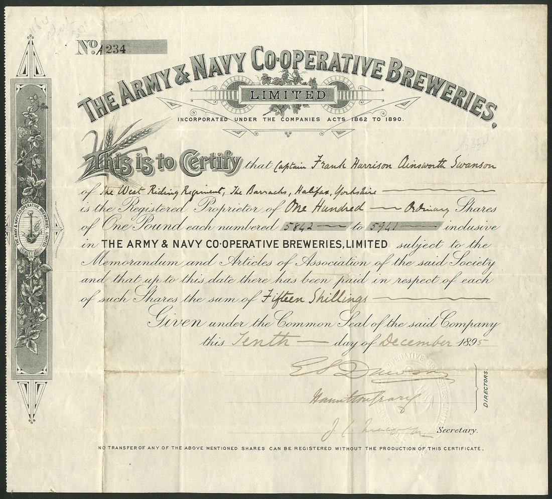 Great Britain: Army & Navy Co-operative Breweries Ltd., £1 shares, 189[5], #234, black. Formed in 1895 mainly for the benefit of the armed forces, the shares being set at £1 so that all ranks could afford to buy them. Wound up in 1902. Together with other brewery certificates comprising Parker's Burslem Brewery Ltd., £10 shares, 191[1], #4860, first debenture stock, 19[47], #28; Aylesbury Brewery Co. Ltd., £10 ordinary shares, 189[6], #8; Oldfield Brewery Ltd., 1st mortgage debenture stock, 189[904], #419, cut cancelled, and, Wilson's Brewery Limited, First Mortgage debenture stock, 1[950], #4961. Generally VF but two have tide marks from prior framing (6).