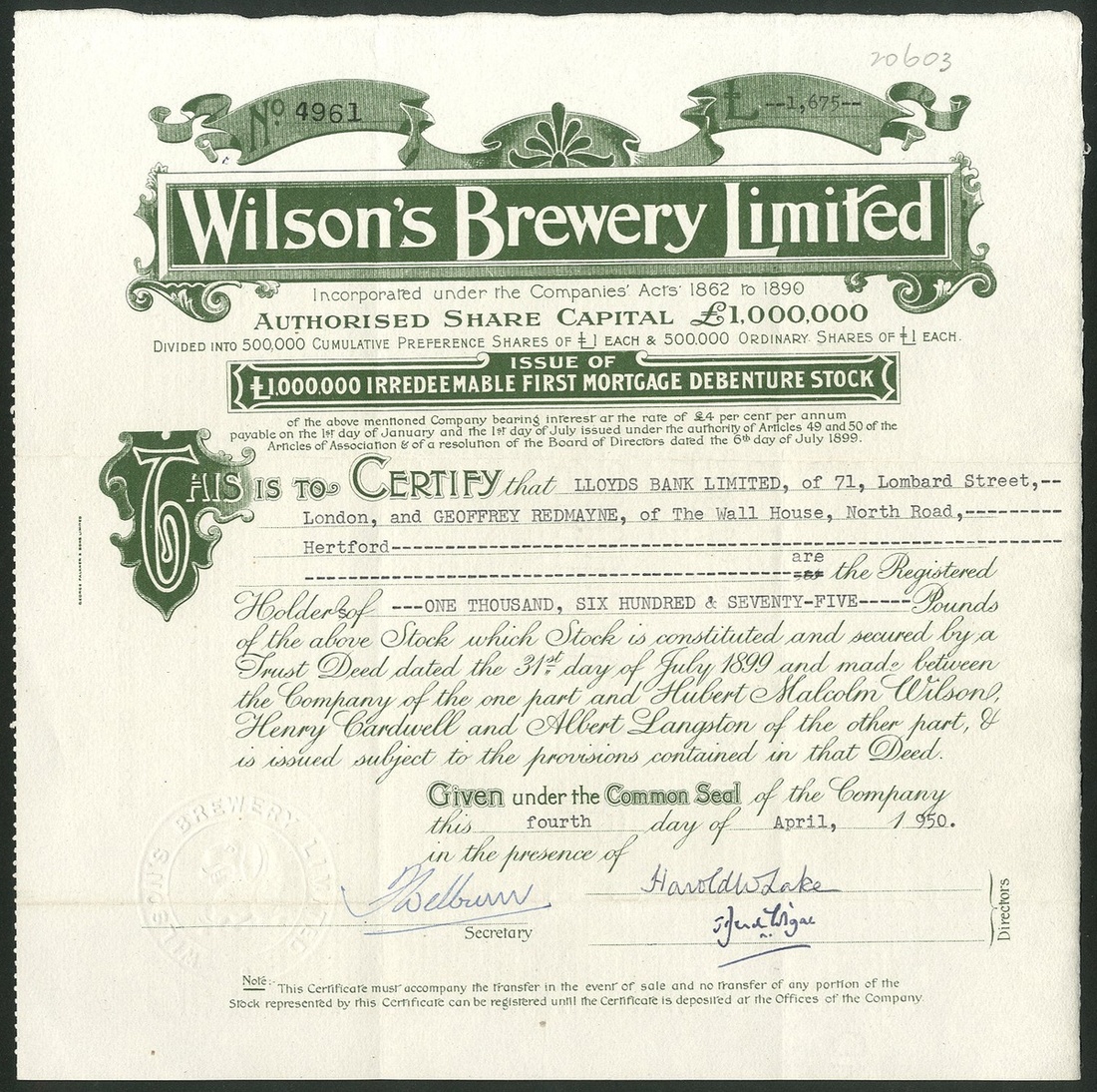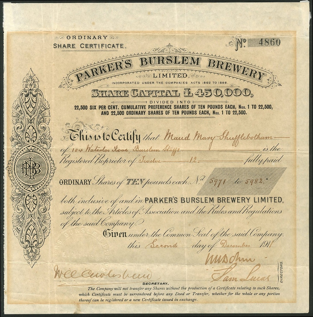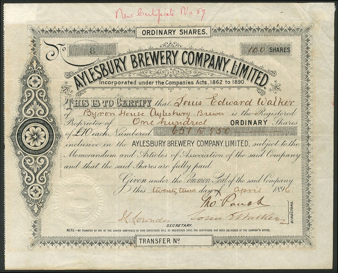 Great Britain: Army & Navy Co-operative Breweries Ltd., £1 shares, 189[5], #234, black. Formed in 1895 mainly for the benefit of the armed forces, the shares being set at £1 so that all ranks could afford to buy them. Wound up in 1902. Together with other brewery certificates comprising Parker's Burslem Brewery Ltd., £10 shares, 191[1], #4860, first debenture stock, 19[47], #28; Aylesbury Brewery Co. Ltd., £10 ordinary shares, 189[6], #8; Oldfield Brewery Ltd., 1st mortgage debenture stock, 189[904], #419, cut cancelled, and, Wilson's Brewery Limited, First Mortgage debenture stock, 1[950], #4961. Generally VF but two have tide marks from prior framing (6).