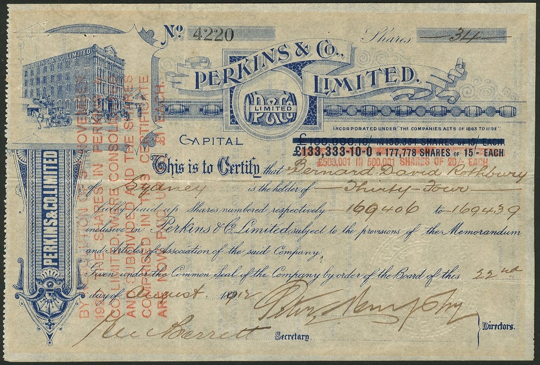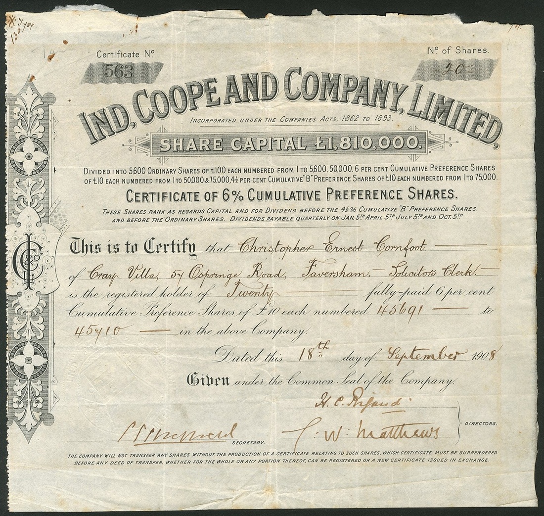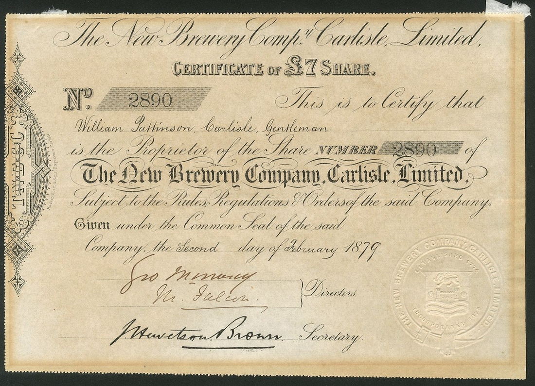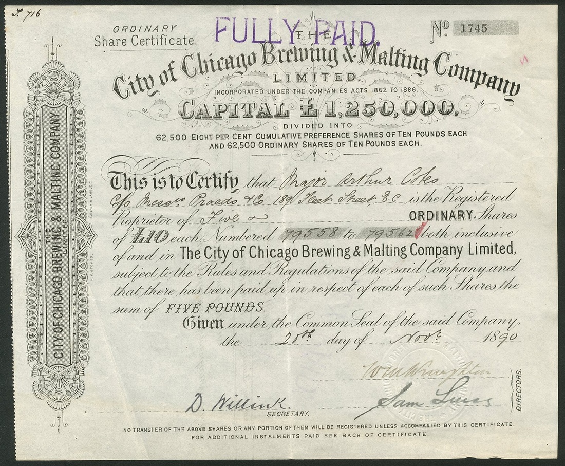Great Britain: Ind, Coope and Co. Ltd., 6% cumulative preference shares, 190[8], #563, black, and, 4½% cumulative 'B' preference shares, 190[7], #1382, red; together with Wiley & Co. Limited, Sheffield, £10 shares, 1[897], #4, blue, red seal, cancelled; City of Chicago Brewing & Malting Co. Ltd., £10 shares, 18[90], #1745, black. An English company owning a brewery in Chicago; Perkins & Co. Limited, 15/- shares (revalued to 20/-), 189[1912], #4220, attractive blue print. Owned breweries in Toowoomba and Brisbane. Merged in 1928 with Castlemaine to form Castlemaine Perkins., and, New Brewery Company, Carlisle, Ltd., £7 share, 18[79], black. The first and last 2 have tide marks from prior framing otherwise VF (6).