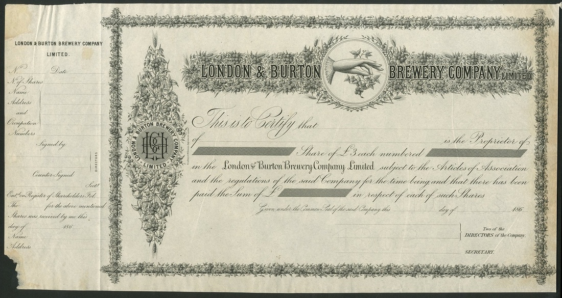 Great Britain: London & Burton Brewery Company Limited, £3 shares, 186-, a specimen certificate from the Bradbury, Wilkinson & Co. archive, vignette of female hand holding some hops, ornate border, black, with counterfoil. Registered in 1862 to acquire the Old Queens Head Brewery and Meakins Brewery in Burton on Trent. Wound up in 1865. Light staining at right edge, EF