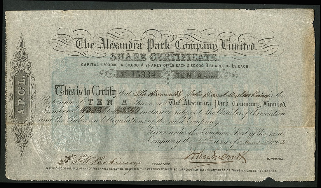 Great Britain: Alexandra Park Company Ltd., 10 'A' shares of £5, 1863, #15334, black, blue underprint. 220 acres in North London were acquired to build a racecourse, cricket ground and other facilities. The 1862 Great Exhibition buildings were rebuilt there in 1873 and renamed Alexandra Palace. Acquired by Trustees in 1900 and by Greater London Council in 1965. Small tear top edge, chip from bottom margin, AVF.