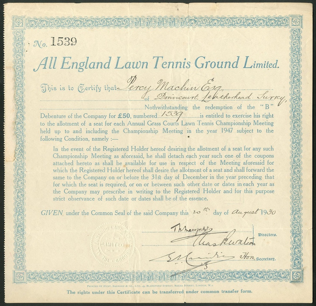 Great Britain: All England Lawn Tennis Ground Ltd., certificate entitling the holder to obtain a seat at the Wimbledon Tennis Championships under the terms of the £50 'B' debenture, #1539, 19[30], blue. Debenture issues have always been the way that the Wimbledon Club and Championships have been financed. Currently debentures are issued every five years and those for 2016-2020 have been priced at £50,000 each! The terms of this debenture allowed the holder to receive tickets for each Championship up until 1947. The debentures were drawn annually and when redeemed the latter certificates were issued allowing the holder to keep receiving Championship tickets. Small tear at top, VF (a similar example sold by us at £170 in 2015).