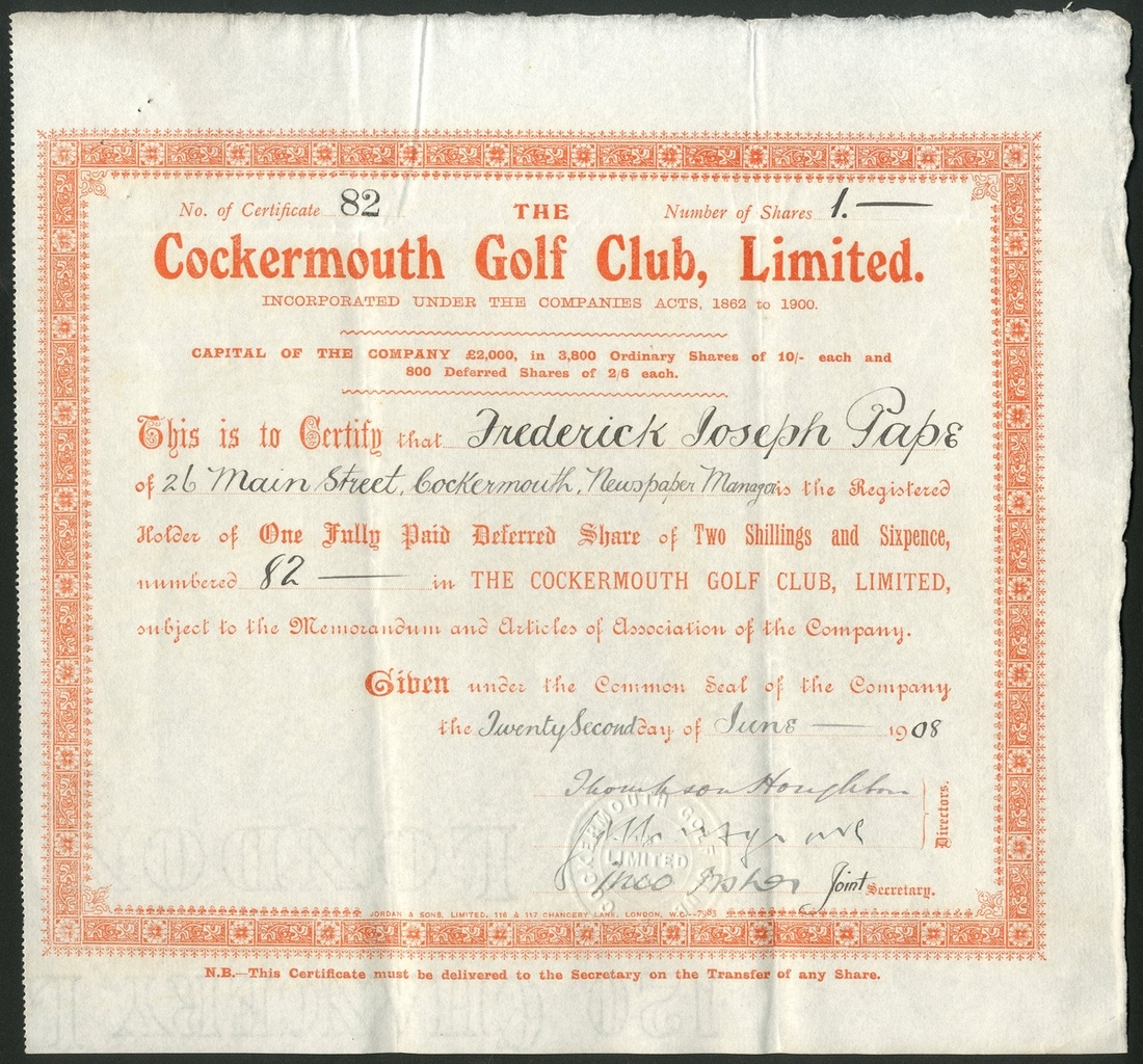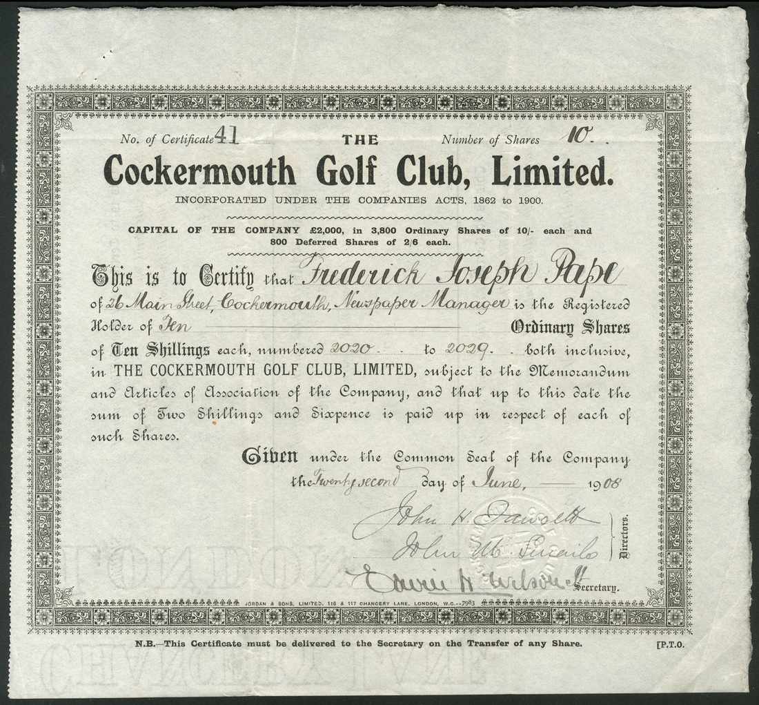 Great Britain: Cockermouth Golf Club Limited, a pair of certificates for 10/- ordinary shares, 19[08], #41, black and 2/6d deferred shares, 19[08], #82, red, both issued to Frederick Joseph Pape. The course was designed by James Braid, a winner of the Open 5 times and a golf course architect at Gleneagles and Carnoustie. GVF (2).
