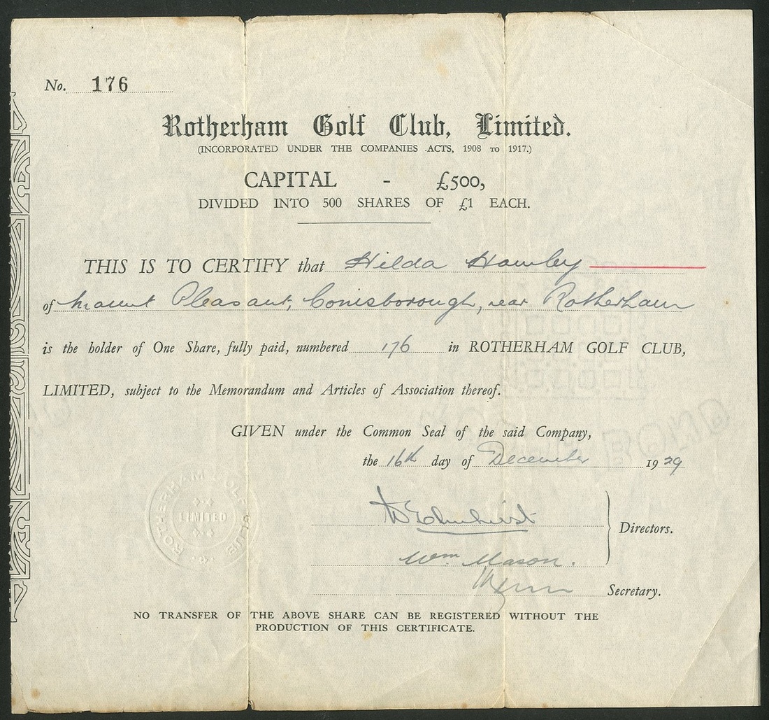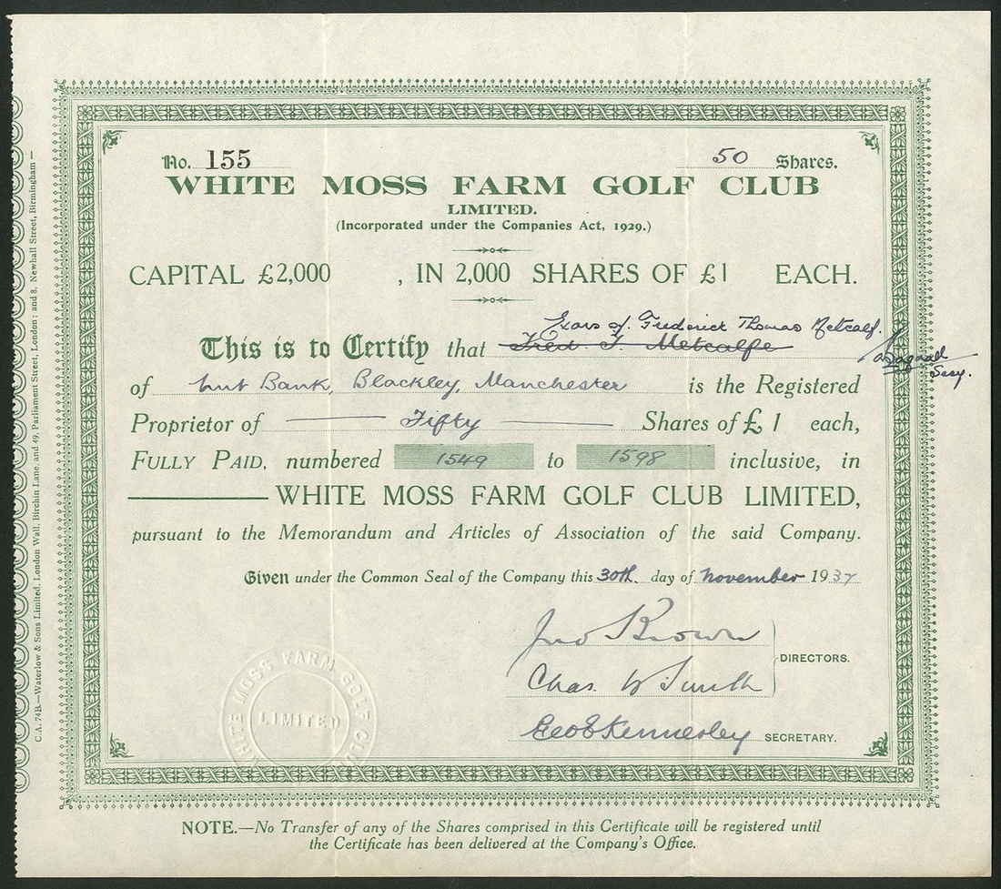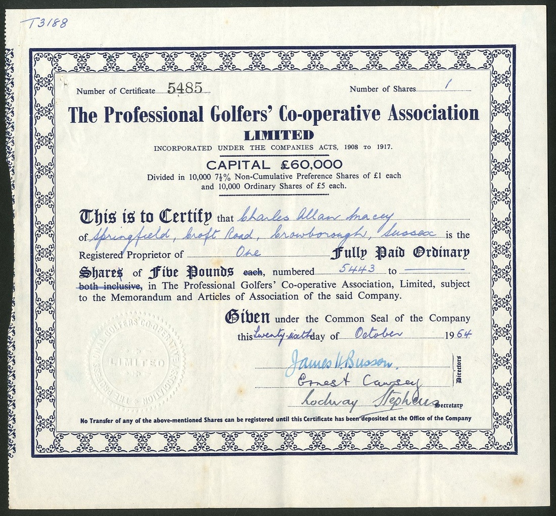 Great Britain: A trio of golf certificates, comprising Rotherham Golf Club Limited, £1 shares, 19[29], #176, black; White Moss Farm Golf Club Ltd., £1 shares, 19[37], #155, green, and, Professional Golfers' Co-operative Association Limited, ordinary £5 shares, 19[54], #5485, blue. F-VF (3).