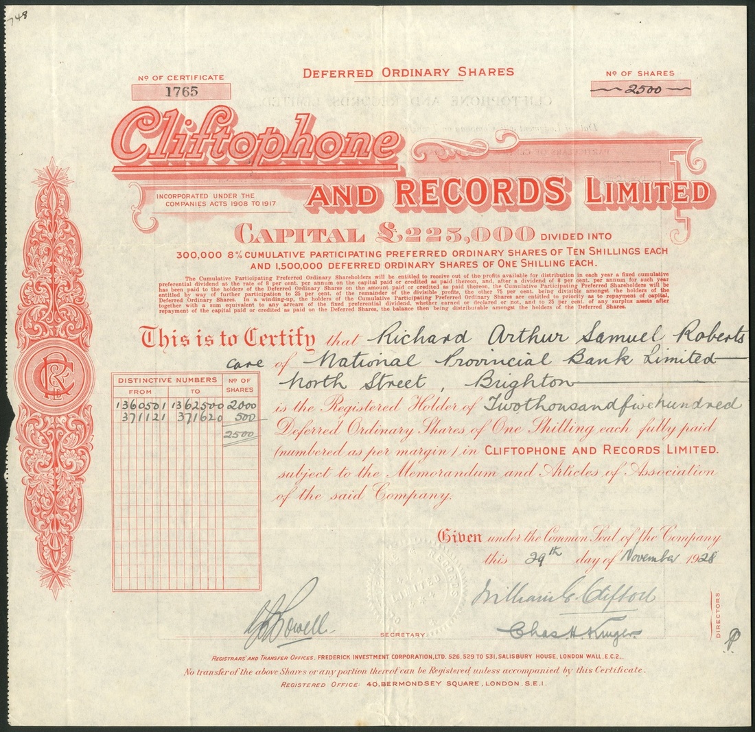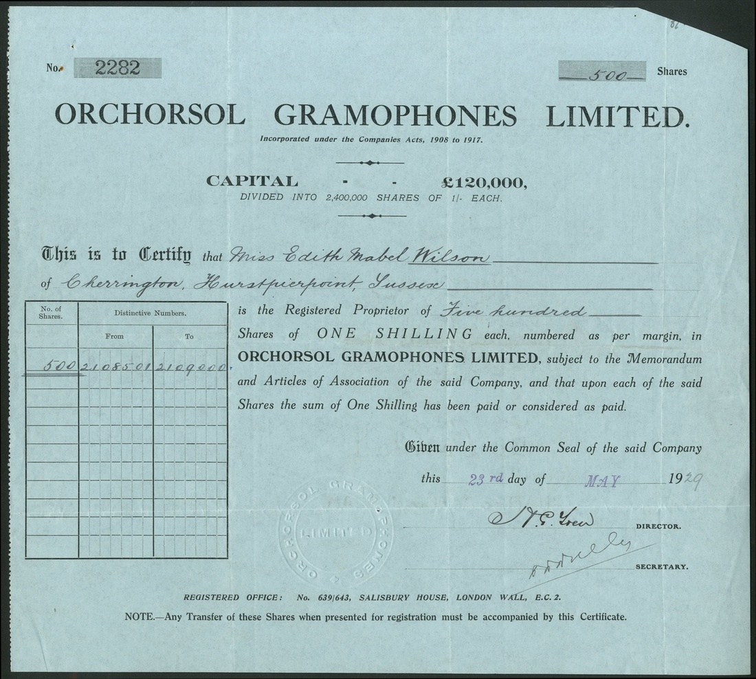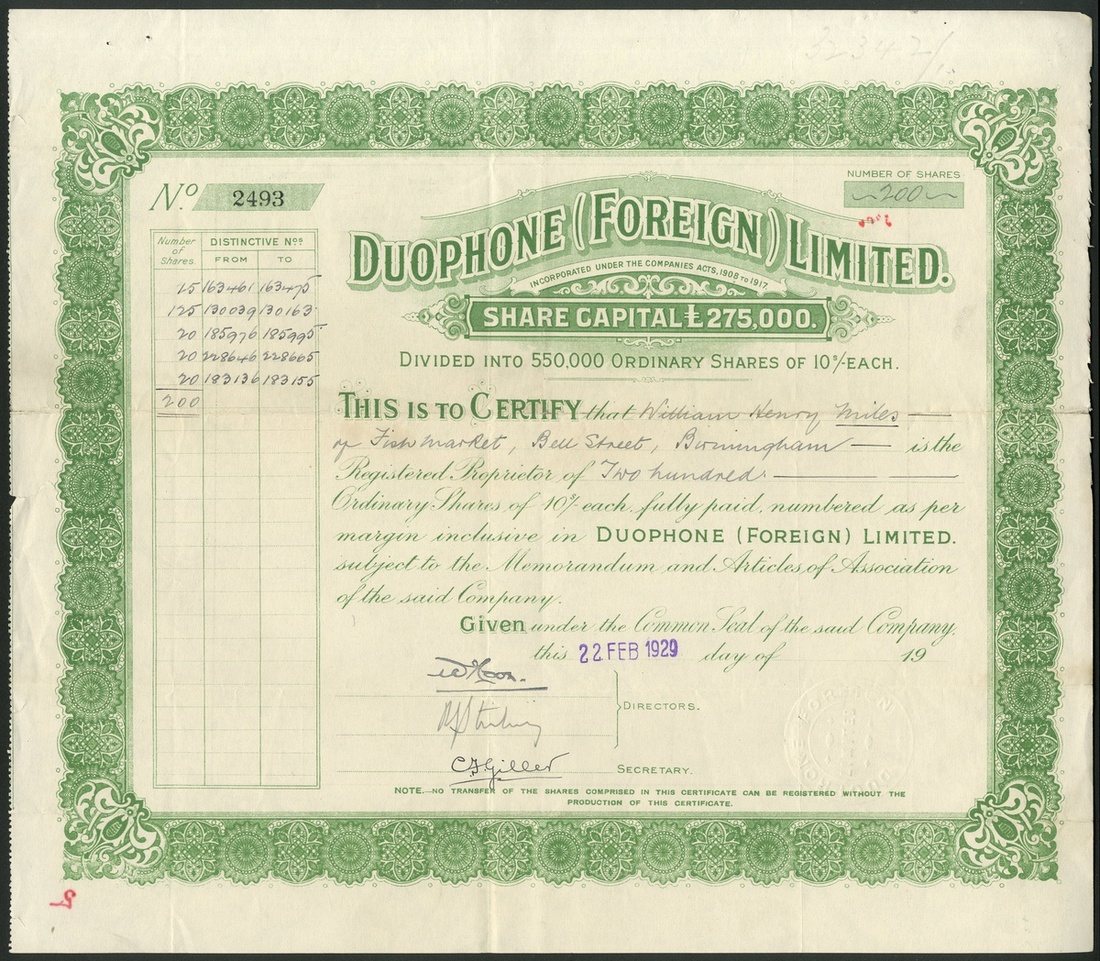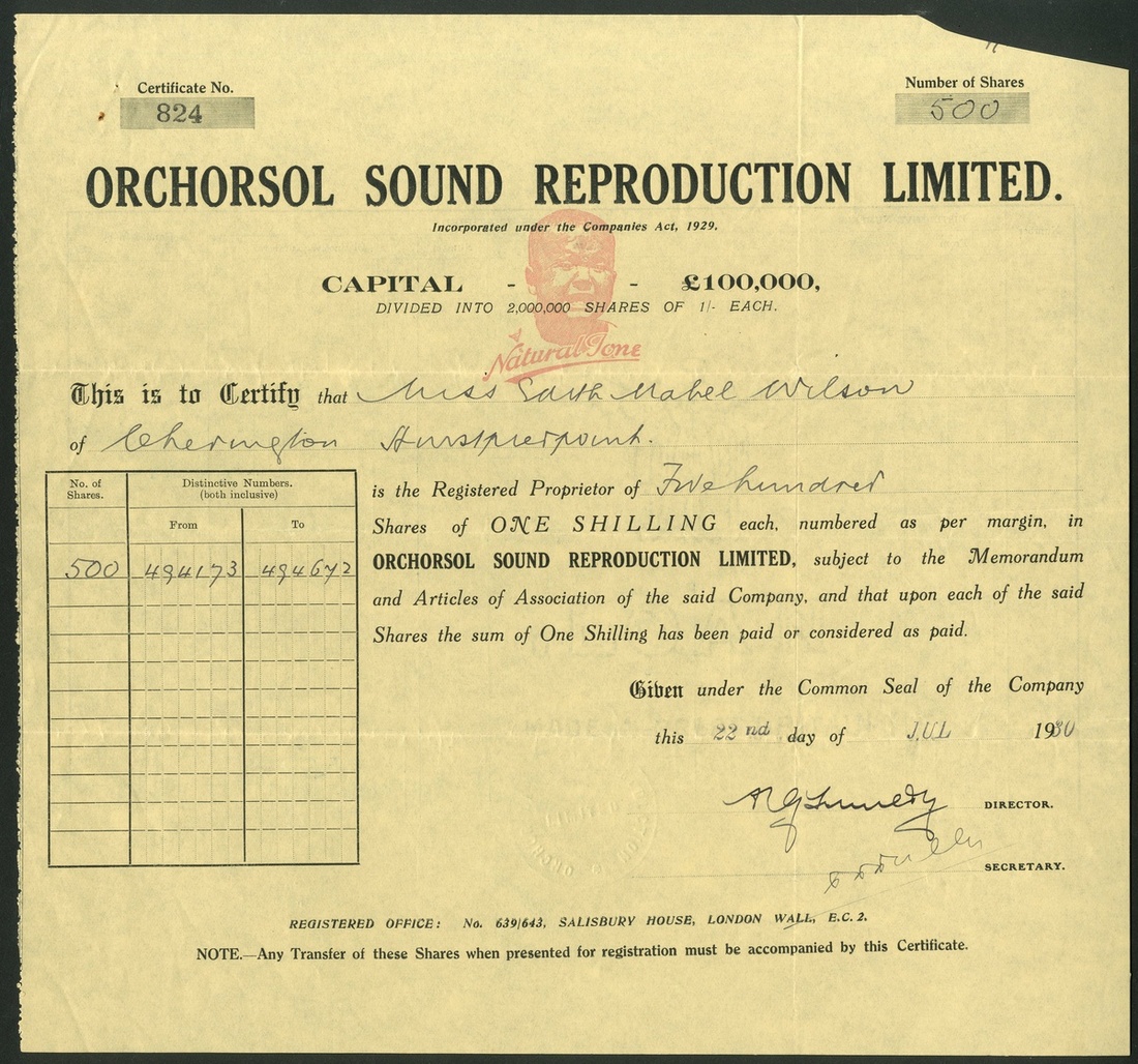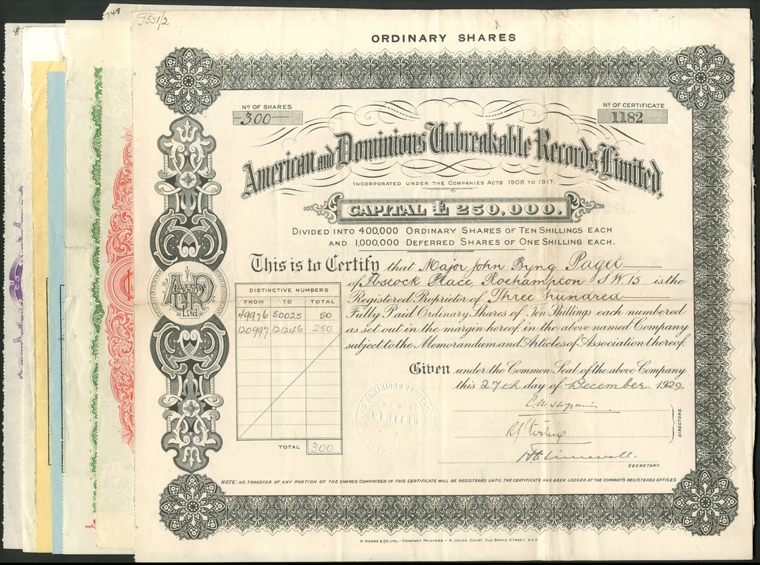 Great Britain: A collection of gramophone and record companies, comprising American and Dominions Unbreakable Records Ltd., 1929; British Brunswick Ltd., 1928; Celebritone Ltd., 1929; Celebrity Gramophones Ltd., 1930; Cliftophone and Records Ltd., 1928; Duophone (Foreign) Ltd., 1929; Orchorsol Gramophones Ltd., 1929; Orchorsol Sound Reproduction Ltd., 1930; Victoria Gramophones Ltd., 1928, and, Worldecho Records Ltd., 1929. The 2 Orchorsol have top corner cut away otherwise VF (10).
