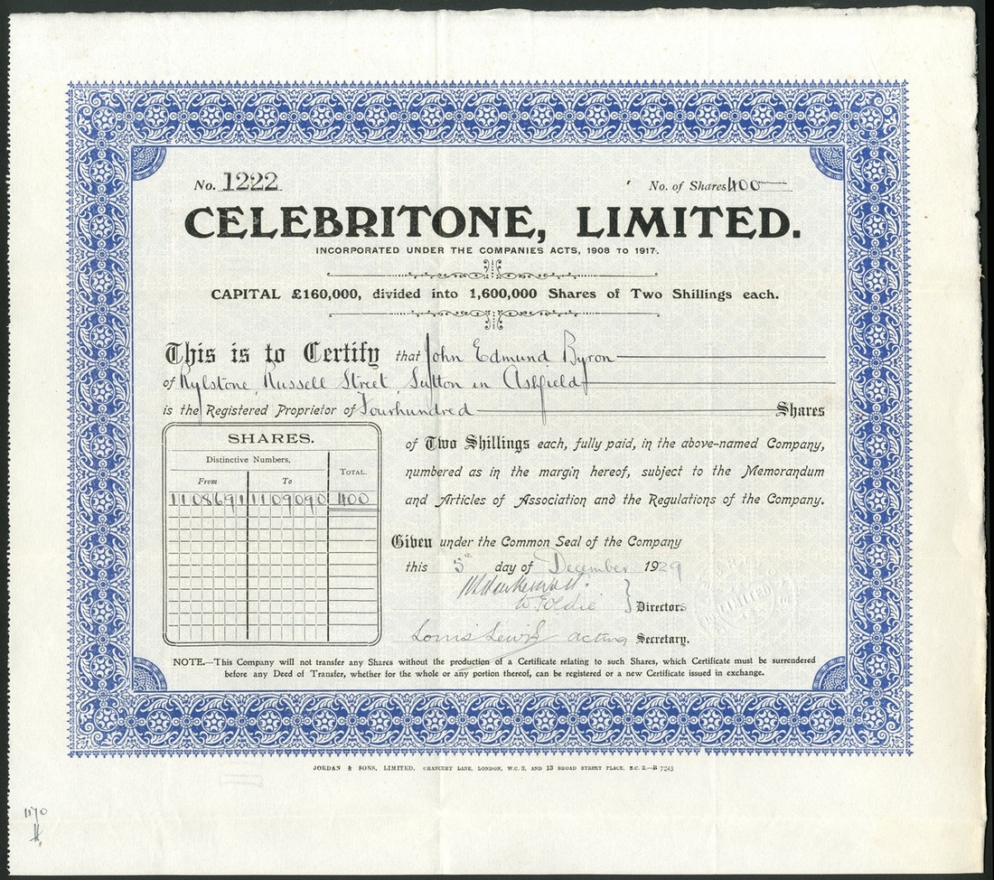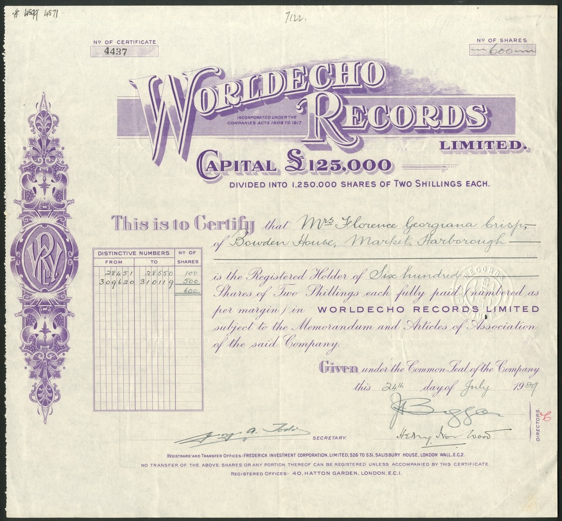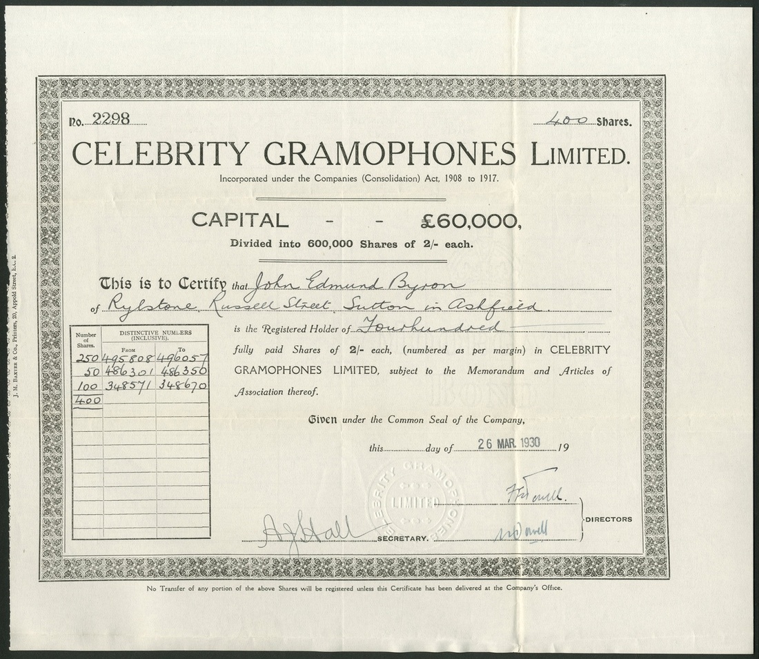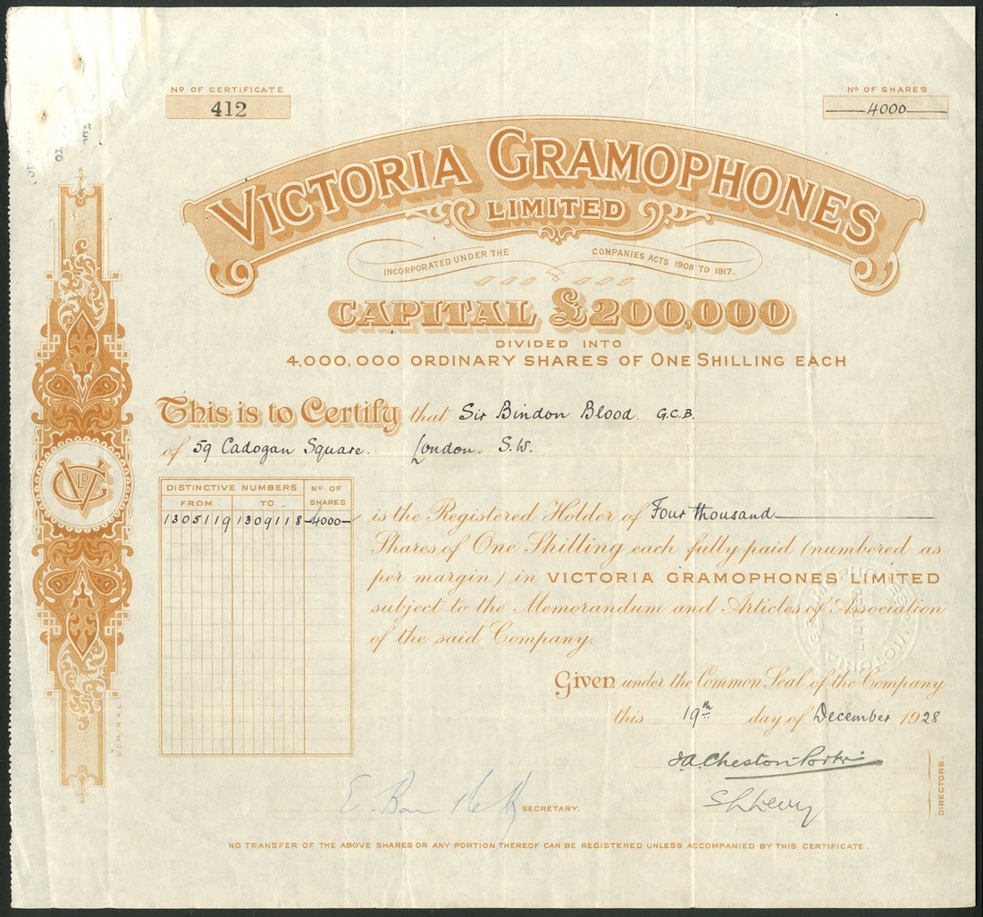 Great Britain: A collection of gramophone and record companies, comprising American and Dominions Unbreakable Records Ltd., 1929; British Brunswick Ltd., 1928; Celebritone Ltd., 1929; Celebrity Gramophones Ltd., 1930; Cliftophone and Records Ltd., 1928; Duophone (Foreign) Ltd., 1929; Orchorsol Gramophones Ltd., 1929; Orchorsol Sound Reproduction Ltd., 1930; Victoria Gramophones Ltd., 1928, and, Worldecho Records Ltd., 1929. The 2 Orchorsol have top corner cut away otherwise VF (10).