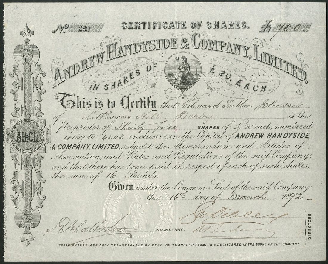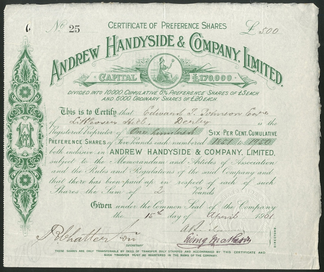 Great Britain: Andrew Handyside & Co. Ltd., a pair of certificates for £20 shares, 187[92], #289, black, and, 6% Cumulative Preference shares, 19[01], #25, green, Britannia in medallion at top and again in the attractive embossed seals. Handyside acquired the Britannia Foundry in 1848, producing ornamental ironwork, lamp postsand even railway bridges. He also made the Post Office standard letterboxes. Railway structures were built at st,. Enoch Station in Glasgow, market hall buildings were sent all over the world and bridges were made in Nottingham (Wilford Toll and Trent) and the Albert Suspension Bridge in London. The largest structure built, said to be the largest in the world, was the roof of the National Agricultural Hall, now known as Olympia. In the 1890's the Barton Aqueduct and the Swing Bridge were made for the Manchester Ship Canal. The firm gradually declined and the foundry was demolished in the early years of the 20th century. GVF (2).