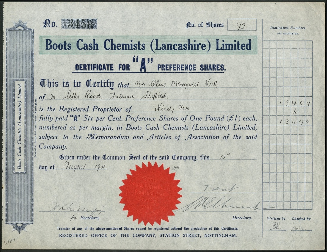 Great Britain: Boots Cash Chemists (Lancashire) Ltd., 'A' preference shares of £1, (1931), #3458, signed by Lord Trent (John Campbell Boot) as director, blue, red seal. Now a household name, Boots was formed in Nottingham by his father in 1849. Jesse Boot (1851-1931), retail chemist. Took over his father's business at an early age, based in Nottingham, and tranformed it into a national chain. Boot was knighted in 1909, created a baronet in 1916, and created Baron Trent, of Nottingham in 1929. He died in June 1931 and his son John Campbell Boot became 2nd Lord Trent. VF and rare.